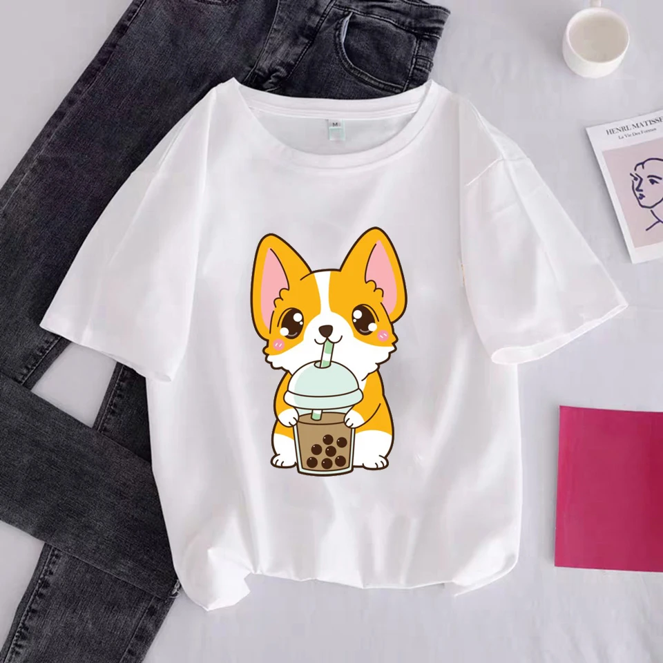 Женские футболки, футболка с мультяшным принтом собаки, графические футболки Ullzang, женские повседневные белые топы, забавная уличная одежда в стиле Харадзюку, женские футболки