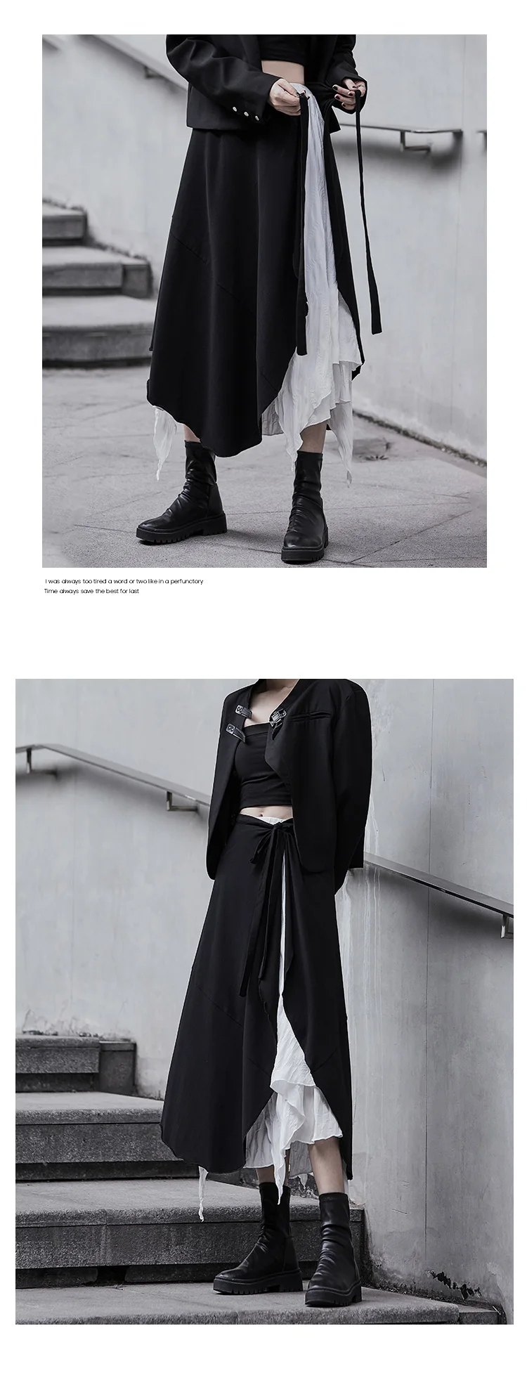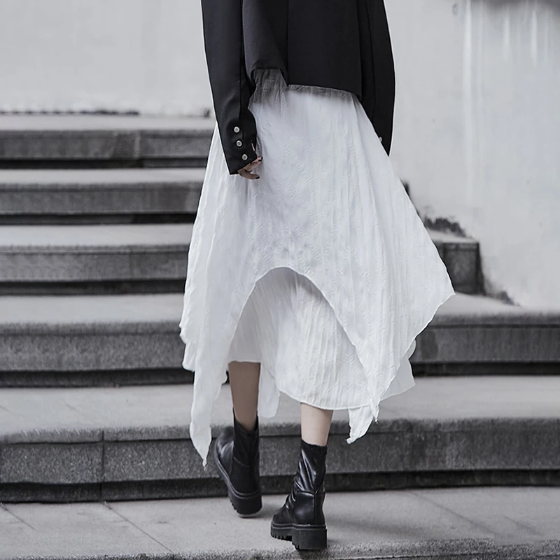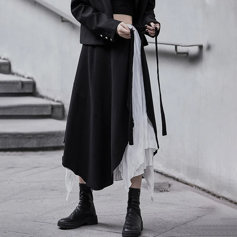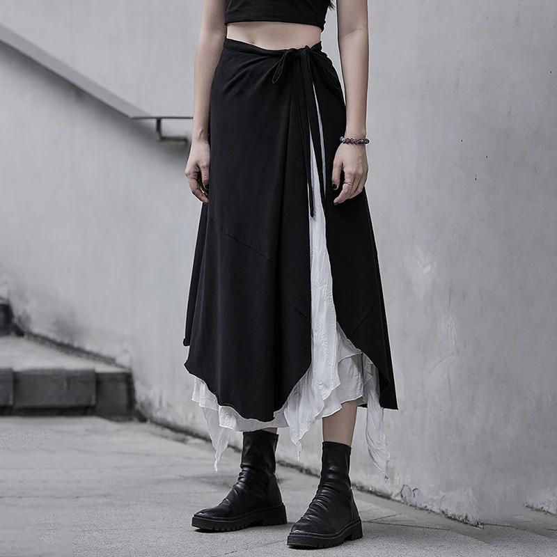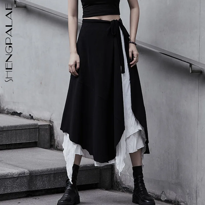 SHENGPALAE Асимметричная черно-белая юбка из двух частей с высокой талией Женская Весенняя Новинка 2021, юбка до середины икры на шнуровке с высокой талией 5B565