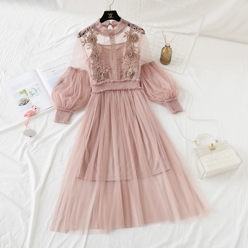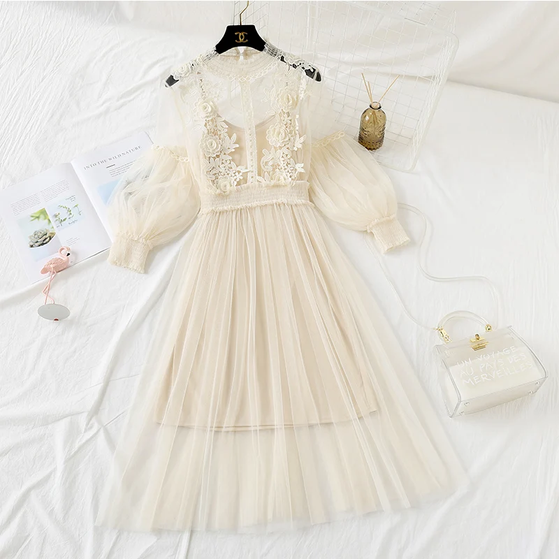 Новое поступление, женское кружевное платье с цветами, газовое длинное платье из вуали с рукавами-фонариками, женское платье принцессы в стиле ретро, комплект из 2 предметов #8013