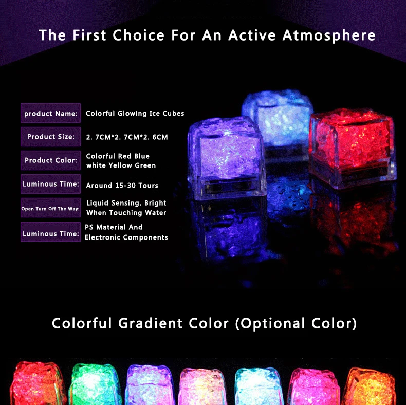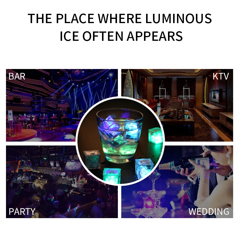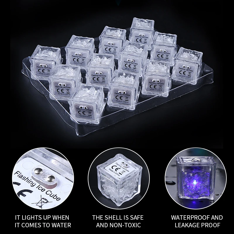2. Вы можете пить алкоголь кубиками льда, но вы не можете добавить слишком горячие напитки. Аккумулятор не сменный. После извлечения кубиков льда из жидкости, пожалуйста, высушите светочувствительное место как можно скорее, так что оно остановится. Свет не потребляет энергии. Конечно, он не должен быть в жидкости, чтобы загориться. Он также загорается при нажатии вручную. Описание характеристики светоизлучающий кубик льда, состоящий из материала PS и электронных компонентов, имеет особенность быть ярким, когда вода входит (жидкая индукция), внешний вид как настоящие кубики льда. Продукт работает на батарейках, без химических изменений, безвреден и может быть помещен во все виды напитков, чтобы добавить романтическую и загадочную атмосферу. Он широко используется в различных праздничных мероприятий, гостиничных барах и других местах.