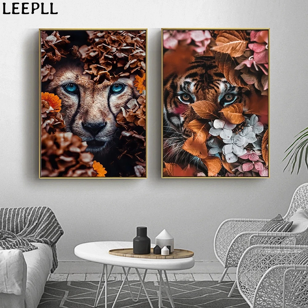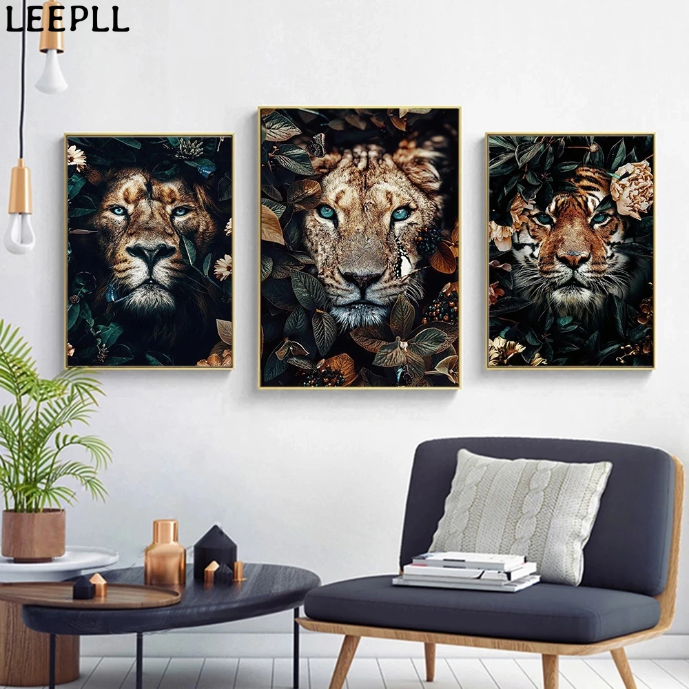 Животные в цветах, холст, живопись, стена, искусство, тигр, слон, лось, орангутан, картина, Современная классическая декоративная живопись