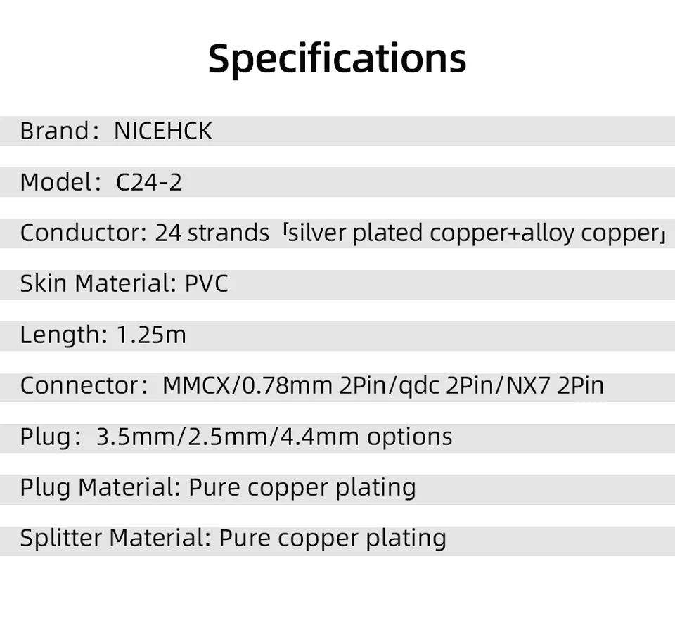 1. Название продукта:NICEHCK C24-2 Высококачественная Посеребренная медь с 24 нитями + медь из сплава2. Бренд:NICEHCK3. Модель:C24-24. Проводник:24 нити посеребренная медь + сплав меди5. Количество ядер:0,05 мм * 9 * + 0,05 мм * 8 каждая нить6. Цвет: темно-синий и серый смешанный7. Материал кожи: ПВХ8. Звуковые характеристики:Улучшенная производительность средних и высоких частот9. Длина: 1,25 м ± 3 см10. Тип штекера:Варианты прямого штекера 3,5/2,5/4,4 мм11. Разъем:MMCX/0,78 мм 2Pin/QDC 2Pin/NX7 2Pin12. Материал штекера: покрытие из чистой меди13. Материал разделителя: покрытие чистой меди14. Товар содержит:Кабель NICEHCK * 1 шт. (наушники в комплект не входят)15. Использование для:1. Разъем MMCX:Новый X-One/U1Лента Shuore/S10/H27Yincrow RW-2000/RW-1000FiiO FD5/FH7/FH5/FH3/FA9/FA7TINHIFI P1/ T2/T2 Pro/T2 plus/T3/T4Smчики BlackBat/ST-10S/ST10/M1/M1 Pro/M2 ProLZ A7/A2/A2s/A3/A3s/A4/A5/A6/A6 Mini/Z04A/Z05ANICEHCK EBX21/EBX/M6/N3/P3/DT600/DT500/DT300Solie MT300/DT6/DT6Pro/KP580/KP520/KP330/KP110/KP120/KP330/PT15/PT25/PT2021/TONEKINGLUCIFER/Ye/TO600/TO400s/TO200/TO180/TO65/ZFRE1 универсальный разъем для наушников MMCX/TS5/TY2/UNICORN/EA/1Q/V10/P10/BL1/Shockwave III/T5/ T3/ TK16S/T6/T88K/T4/DANDY aspis Viridisand и т. д..2. 2-контактный разъем 0,78 мм: