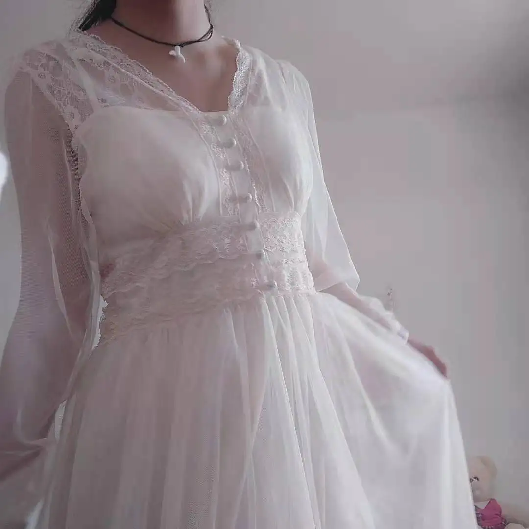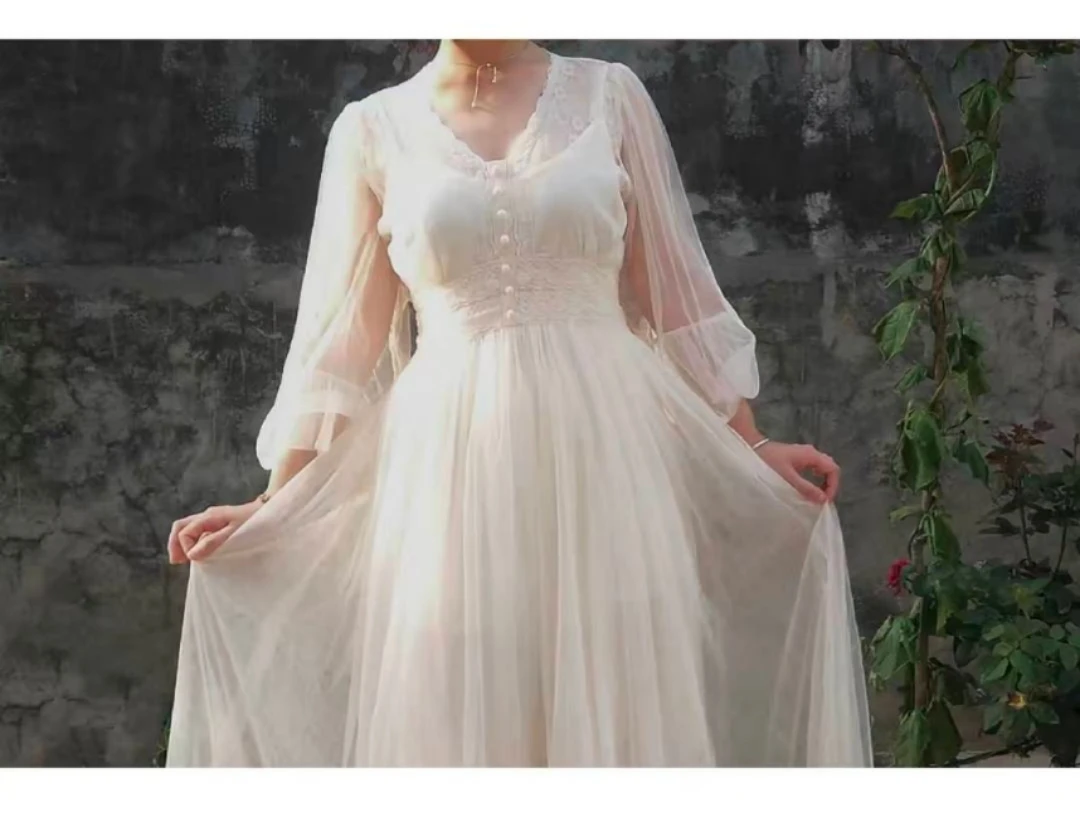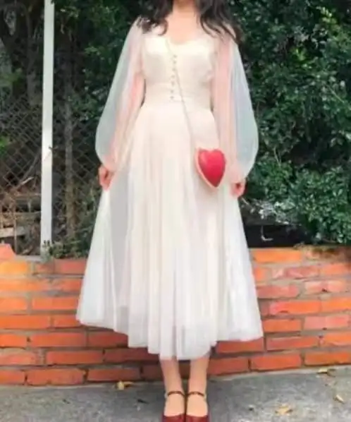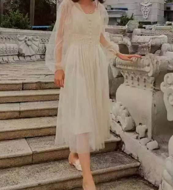 Женское Хлопковое платье, летнее платье абрикосового цвета, винтажная одежда, женское платье трапециевидной формы на пуговицах, с пышными рукавами, кружевная вуаль