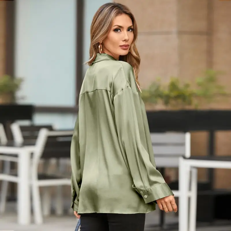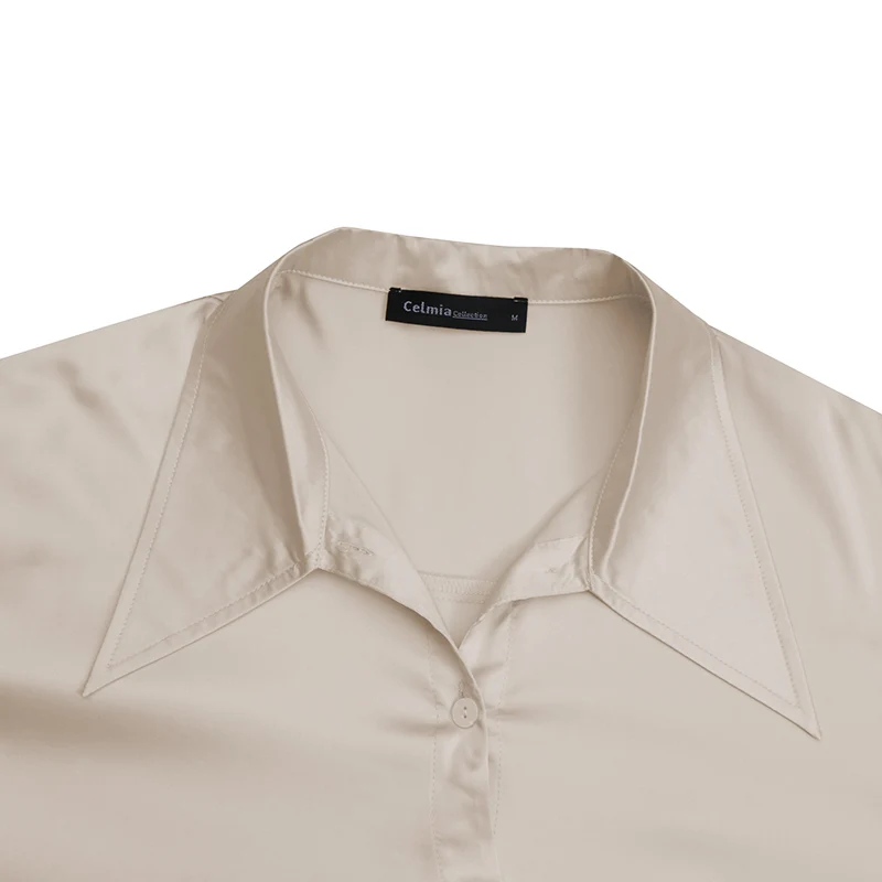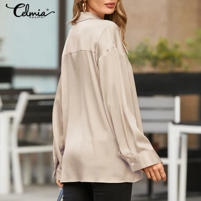 Элегантная атласная блузка Celmia, женские стильные элегантные офисные рубашки с длинным рукавом, однотонные повседневные офисные топы на пуговицах с лацканами, 7