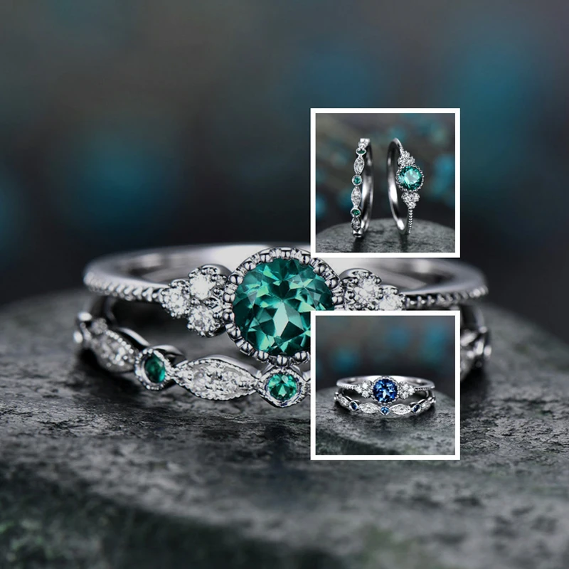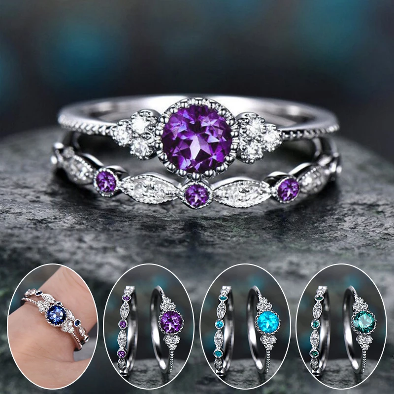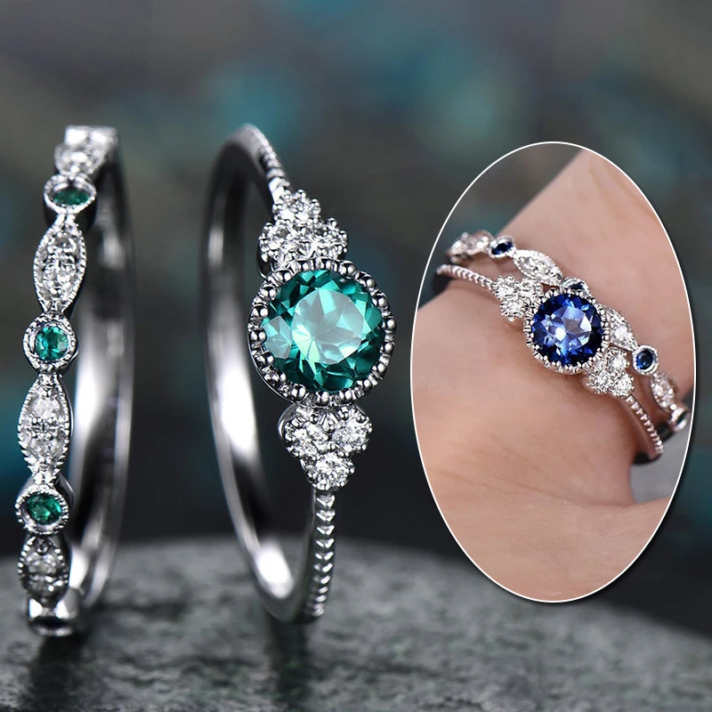 Набор двойных колец для женщин, обручальное кольцо с круглым зеленым, синим цирконием, 5 цветов, на День святого Валентина