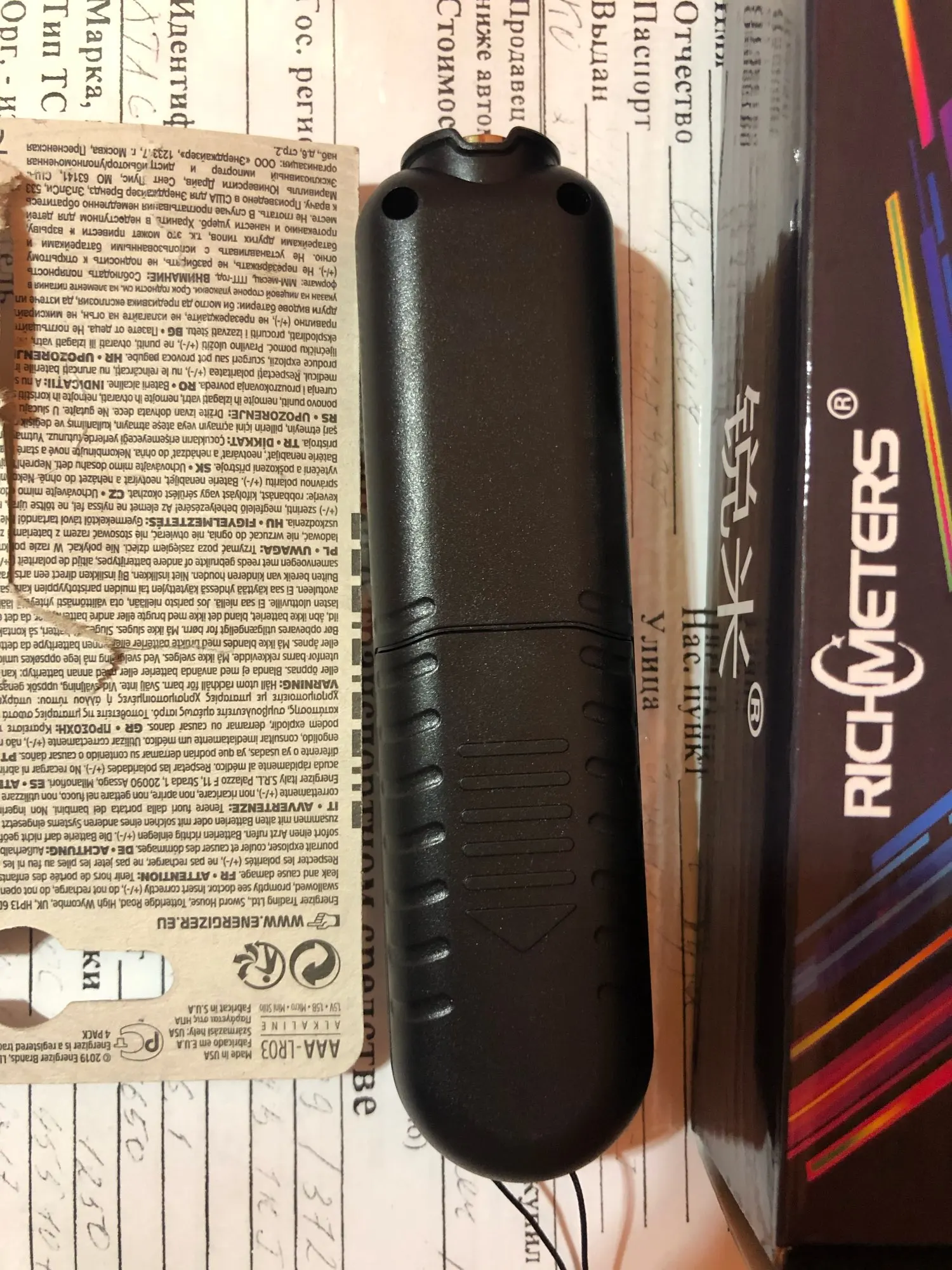 коробка мятая, батареек в комплекте не было (хотя место есть для них), прибор работает