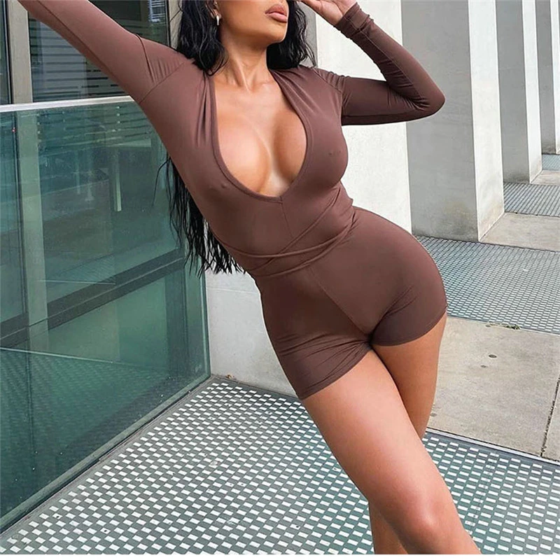 Женский комбинезон с открытой спиной, однотонный Облегающий комбинезон коричневого цвета с длинным рукавом и глубоким V-образным вырезом, лето 2021
