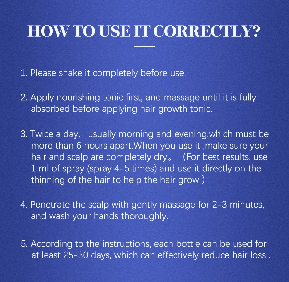 Дважды в день, для достижения наилучших результатов, пожалуйста, используйте 1 миллилитровый спрей около 4 -5 спрей), непосредственно Используйте для меньшего объема волос, без волосяной части головы, помогает росту волос; Увеличение количества использования или использования не может улучшить эффект использования; Согласно инструкции, Каждая бутылка используется для как минимум 25-30 дней, может эффективно уменьшить выпадение волос и выпадение волос.