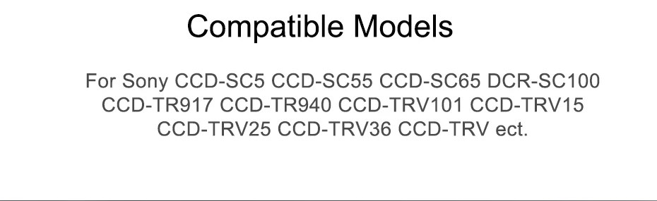 Для SONY:DCR-SC100 CCD-SC55 CCD-SC65 CCD-TR3000 CCD-TR3300CCD-TR516 CCD-TR555 CCD-TR67 CCD-TR716 CCD-TR76CCD-TR818 CCD-TR84 CCD-TR87 CCD-TR910 CCD-TR917 CCD-TR930CCD-TR940 DCR-TR7000 CCD-TR3300 CCD-SC55 CCD-SC65 CCD-TR3000CCD-TRV101 CCD-TRV11 CCD-TRV15 CCD-TRV215 CCD-TRV25CCD-TRV30 CCD-TRV36 CCD-TRV41 CCD-TRV43 CCD-TRV46 CCD-TRV51CCD-TRV57 CCD-TRV58 CCD-TRV615 CCD-TRV62 CCD-TRV65 CCD-TRV66CCD-TRV67 CCD-TRV68 CCD-TRV72 CCD-TRV75 CCD-TRV81 CCD-TRV815CCD-TRV82 CCD-TRV85 CCD-TRV87 CCD-TRV88 CCD-TRV90 CCD-TRV91CCD-TRV93 CCD-TRV95 CCD-TRV98 CCD-TRV99 CCD-TRV715 CCD-TRV940CCD-TR910 CCD-TR917 CCD-TR93 DCR-VX2100 HDR-FX1 HVR-Z1UDCR-SC100 CCD-SC55 CCD-SC65 CCD-TR3000 CCD-TR3300CCD-TR516 CCD-TR555 CCD-TR67 CCD-TR716 CCD-TR76CCD-TR818 CCD-TR84 CCD-TR87 CCD-TR910 CCD-TR917 CCD-TR930CCD-TR940 DCR-TR7000 CCD-TR3300 CCD-SC55 CCD-SC65 CCD-TR3000CCD-TRV101 CCD-TRV11 CCD-TRV15 CCD-TRV215 CCD-TRV25CCD-TRV30 CCD-TRV36 CCD-TRV41 CCD-TRV43 CCD-TRV46 CCD-TRV5Особенности:1. Литий-ионные аккумуляторы премиум класса2. Высокая плотность энергии, долгий срок службы, без памяти3. Дополнительная мощность, больше снимков для ваших камер