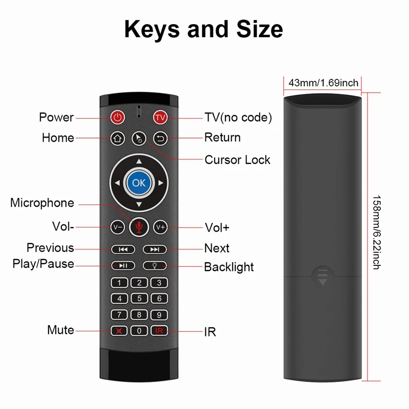 Передача и управление: 2,4G беспроводнойКлючевые номера: 29 клавишПоддержка 27 клавиш ИК-обученияРасстояние дистанционного управления: около 10 мТип батареи: AAAx2 (не входит в комплект)Потребляемая мощность: около 10 мА в рабочем состоянииПотребляемая мощность микрофона: около 20 мАПоддержка ОС: Android, Windows, Mac OS и Linux и т. Д.Цвет: черныйМатериал: пластикРазмер: 157x42x16 ммПосылка:1 * голосовое дистанционное управлениеТолько вышеуказанная посылка, другие товары не включены.Примечание: светильник и различные дисплеи могут привести к тому, что цвет товара на картинке немного отличается от реального. Допускается погрешность в измерениях +/- 1-3 см.