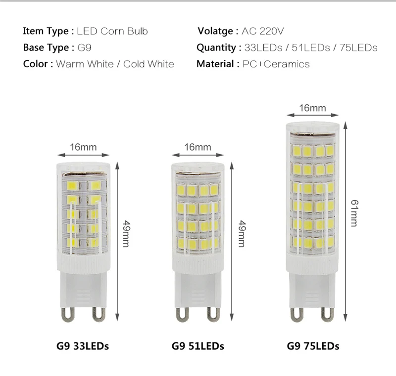 Описание товара: 1. Мощность: 5 Вт/7 Вт/9 Вт/12 Вт/15 Вт 2. Напряжение: ac220в 3. Разъем: G9 4. Модель светодиодного чипа: 2835SMD 5. Светодиодный индикатор: 33 светодиодный s/51 светодиодный s/51 светодиодный s/75 светодиодный s/86 светодиодный s 6. Индекс цветопередачи: Ra80 7. Цветовая температура: холодный белый 6000-6500K, теплый белый 2800-3200K 8. Угол луча: 360 градусов 9. Срок службы:>30000 часов