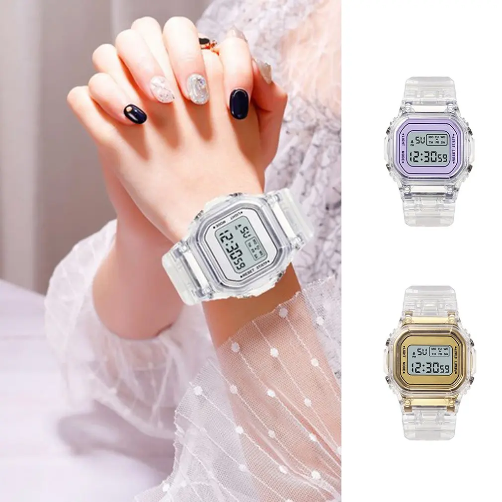 Прозрачные цифровые водонепроницаемые спортивные часы, можно носить детьми и взрослыми.