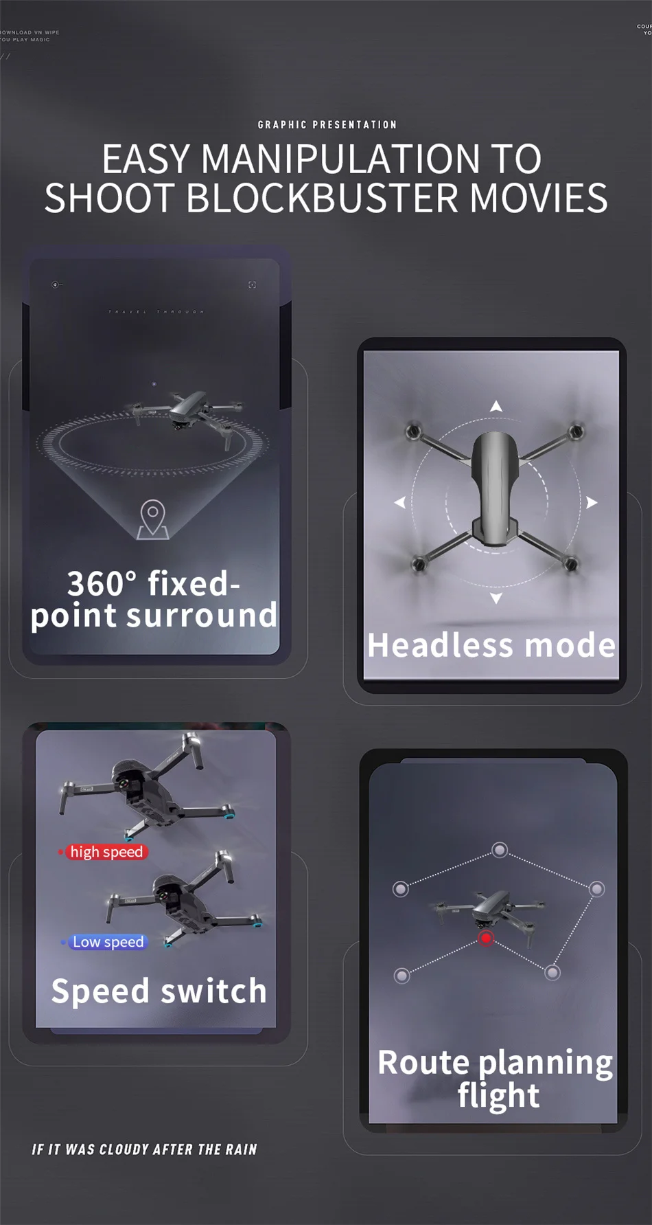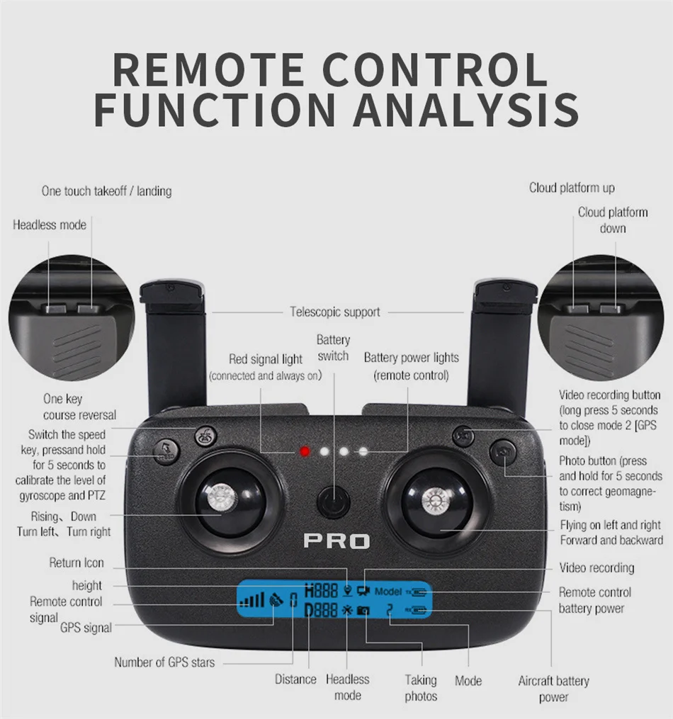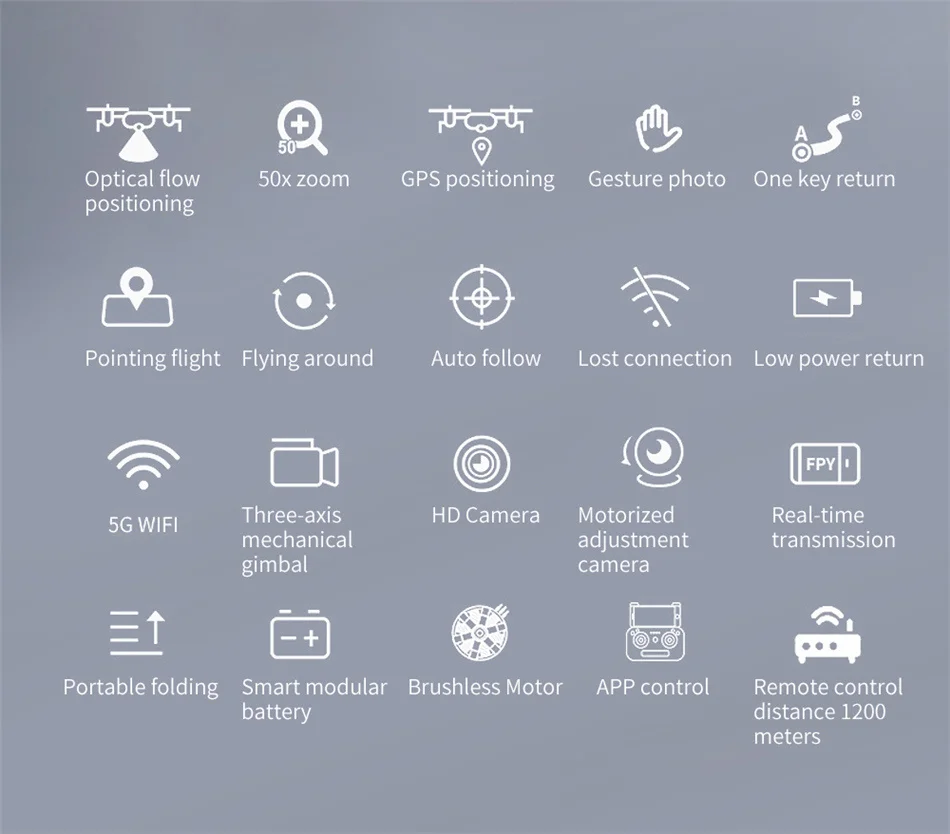 1. GPS возвращается в точку снятия с одной кнопкой, низкая мощность возврата, без сигнала. 2. ① GPS smart follow: после того, как самолет подключен к GPS, Откройте функцию приложения follow, и самолет будет перемещаться на мобильный телефон. ②Изображение: 1-5 м от самолета для идентификации объекта и автоматического следования за полетом. 3. Распознавание жестов: в пределах 1-5 м от самолета, лицом к камере, чтобы сделать фото жестом/жестом камеры. 4. Многоточечное планирование маршрута: самолет будет летать автономно в соответствии с заданным маршрутом, и игрок будет фокусироваться на съемке. 5. Окружность фиксированной точки: Найдите центр круга, а затем перемещайте желаемый радиус круга через джойстик. 6. Функция поиска самолета: нажмите на значок gps-сигнала 3 раза, чтобы открыть интерфейс карты, карта отображает последнее расстояние, широту и долготу самолета. 7. Функция MV: фильтры, видеоэффекты, добавление фоновой музыки, обмен фотографиями/видео Описание Датчик давления: установка высоты Мотор: 1806 бесщеточный мотор Мощность двигателя: 1700/кв Регулировка электрической мощности: 30A Способ приема изображения: 5G WIFI Шарнир: трехосевая Механическая самостабилизирующая головка Объектив: самостабилизирующий электронный анти-Вибрационный объектив Макс дистанционный пульт Размер зажима для телефона: 5,5 дюймов Аккумулятор пульта дистанционного управления: 1,5 V AA батарея * 4 (не прилагаются) Емкость интеллектуального литиевого аккумулятора: 7,6 В 3400 мАч Расстояние управления (свободное взаимодействие и отсутствие окклюзии):1200 м Время полета: около 26 минут Время зарядки: около 6 часов Usb-зарядка: 5 В Размер изделия: разворачивается 32x40x8 см, складывается 18x9x8cm Вес изделия: 534 г Пиксель: 4K HD камера Название приложения: HFun PIus(IOS Android) Карданный угол (диапазон регулировки угла) 110 ° автоматическое восстановление (вертикальное) 65 ° автоматическое восстановление (сбоку) 45 ° автоматическое восстановление (по горизонтали) Объектив камеры: регулируемая камера с помощью передатчика, 110 ° Расстояние передачи изображения Wi-Fi (свободное взаимодействие и отсутствие окклюзии): около 800 м GPS следуй за мной: 30 м Изображение Следуйте за мной: 1-5 м Фокусное расстояние: 50x Ручная съемка жестов/видеозапись: 1-5 м Разрешение видео (фронтальная камера) 2048*1080(TF) Режим SD: 1208*720 (приложение) Режим HD: 2048*1080 (приложение) Разрешение фото (фронтальная камера) 4096*3072P(TF) 4096*3072P (приложение) Разрешение видео (вниз-камера):1280*720p Разрешение фото (вниз-камера) :1280*720p Частота кадров: 25 кадров в секунду Посылка включает в себя: 1 x Квадрокоптер SG908 RC 1 х пульт дистанционного управления 1x7,6 V 3400mAh Lipo батарея 4 запасных пропеллера 1 х USB кабель для зарядки 1 отвертка 8 x запасной винт 1 x Руководство пользователя