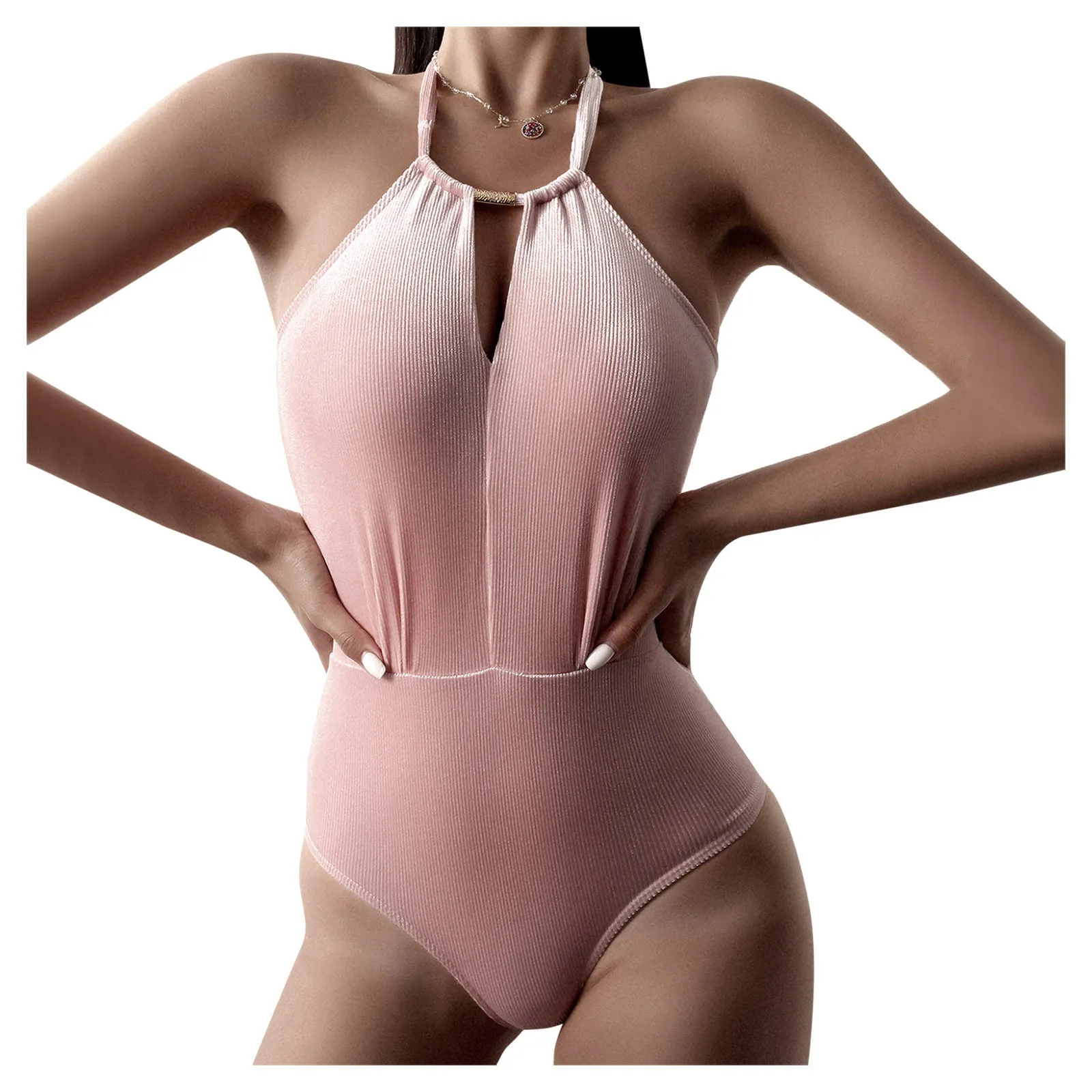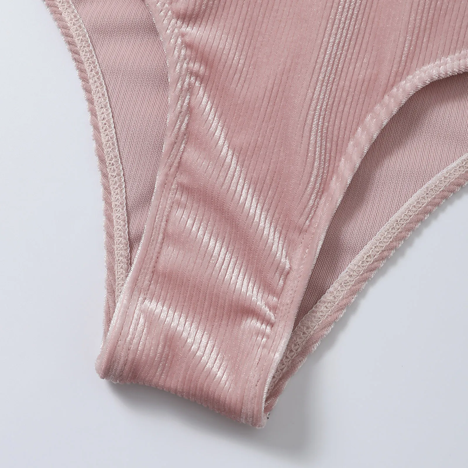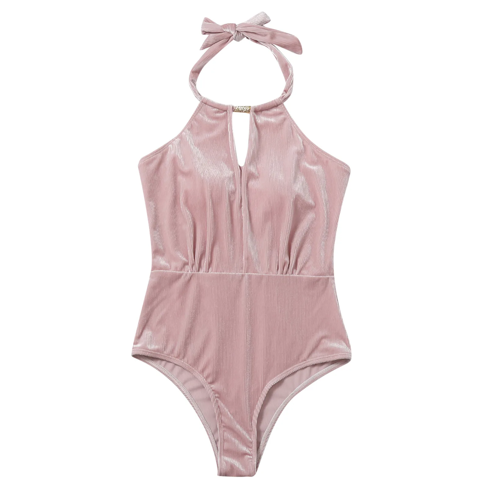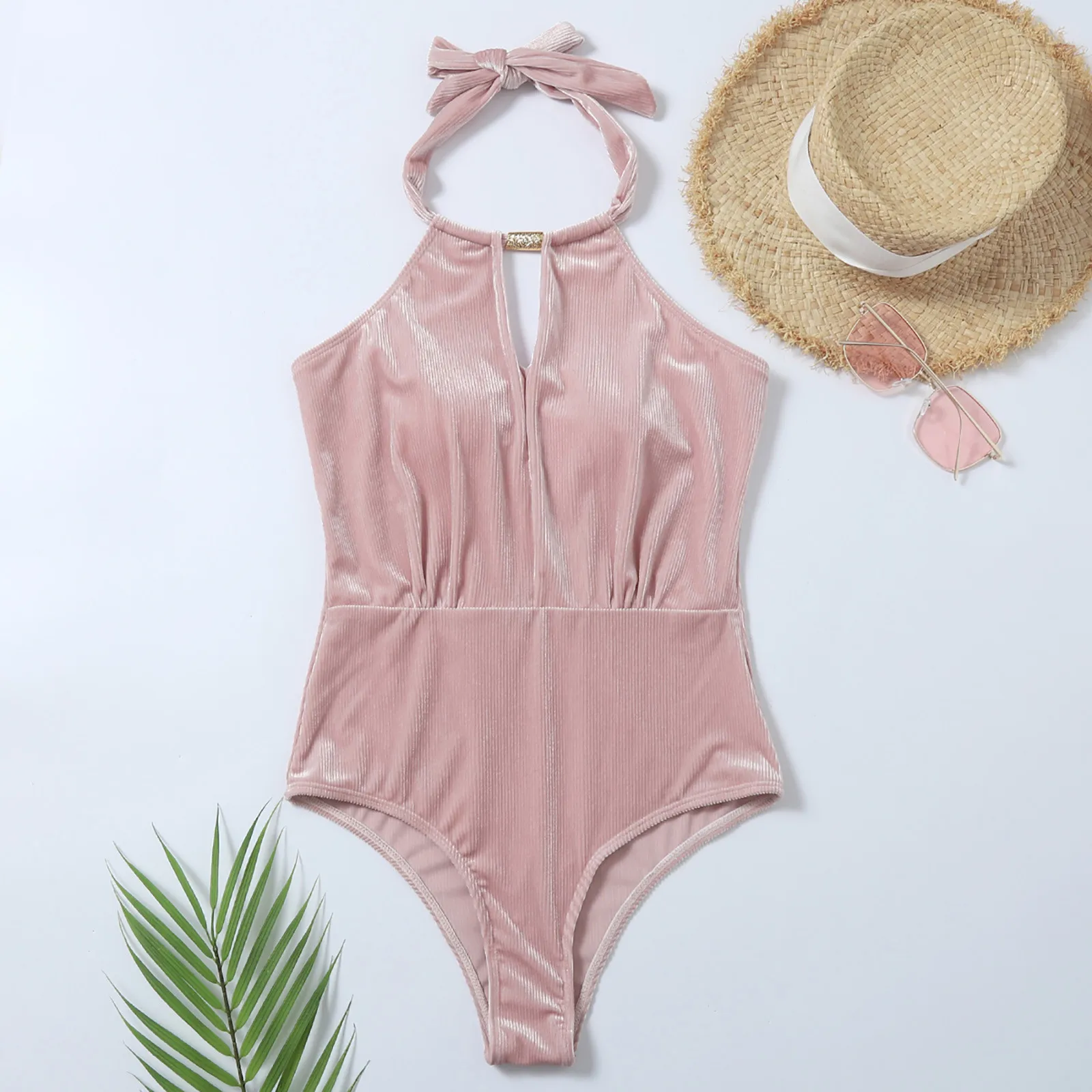 Женский розовый купальник, новый модный бархатный купальник с металлической пряжкой и открытой спиной