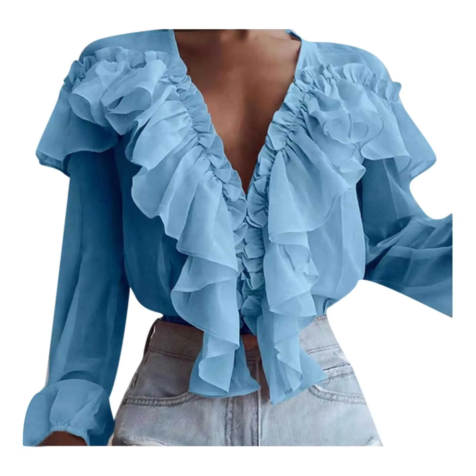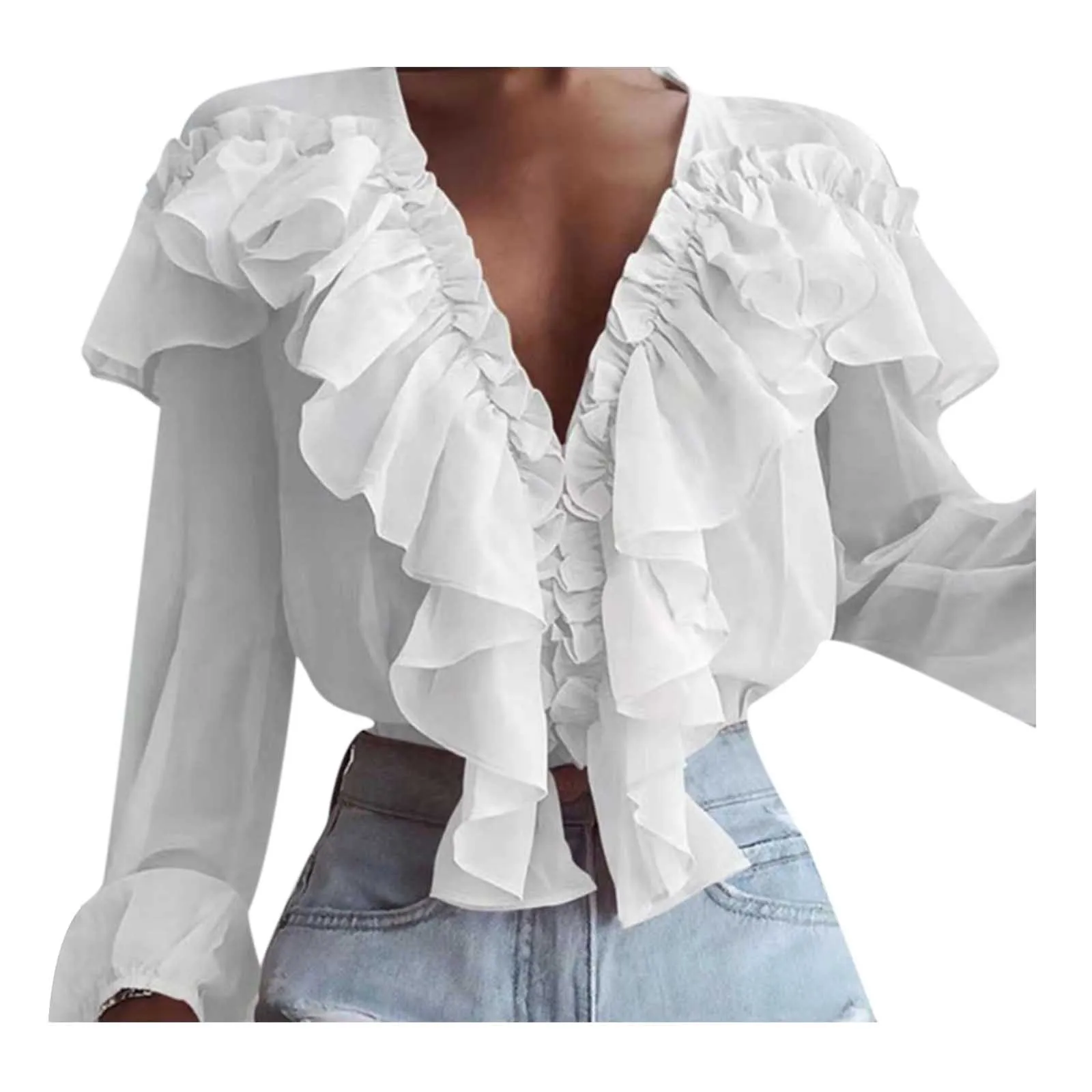 Однотонная блузка с оборками, Женская туника с длинным рукавом, топ...