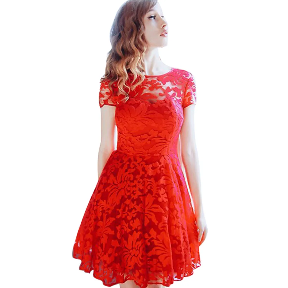 Темпераментное модное кружевное платье с круглым вырезом и коротким рукавом