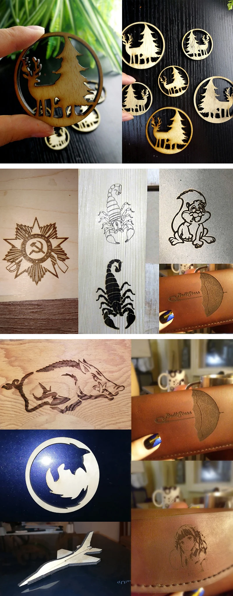 Лазерная гравировка: МДФ/балса/бумага/дерево/ткань/пластик/кожа/Фанера/Пена/бумага /Анодированный алюминий/керамика/камень/нержавеющая сталь (с 15 Вт) 15 Вт лазер может отрезать: Около 3 мм деревянные материалы Лазер не может гравировать: Металл/стекло/печатная плата/светоотражающий материал/прозрачный материал Резцы могут быть выгравированы: Пластик, дерево, акрил, ПВХ, pcb, дерево или аналогичный материал