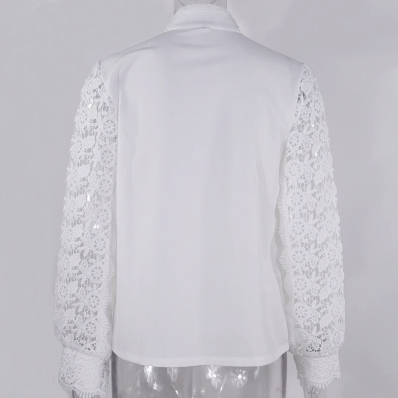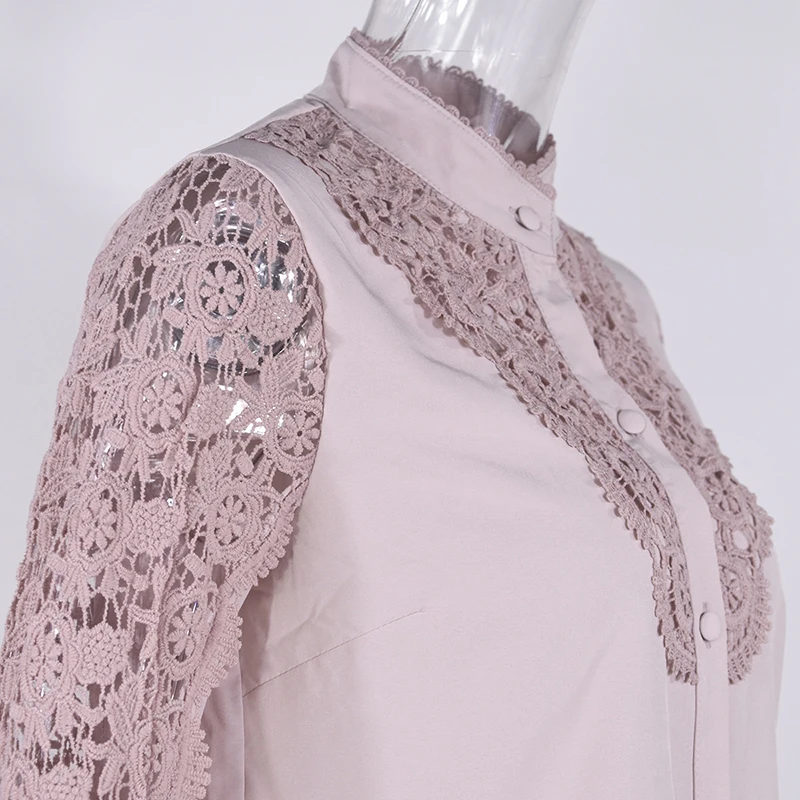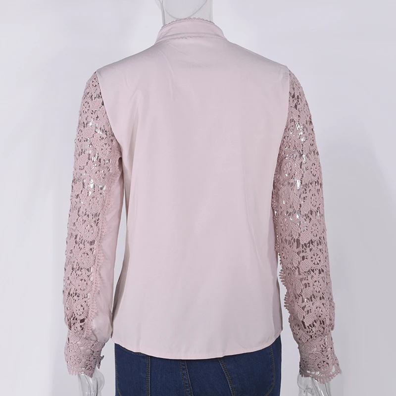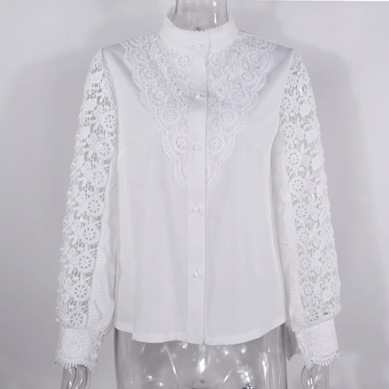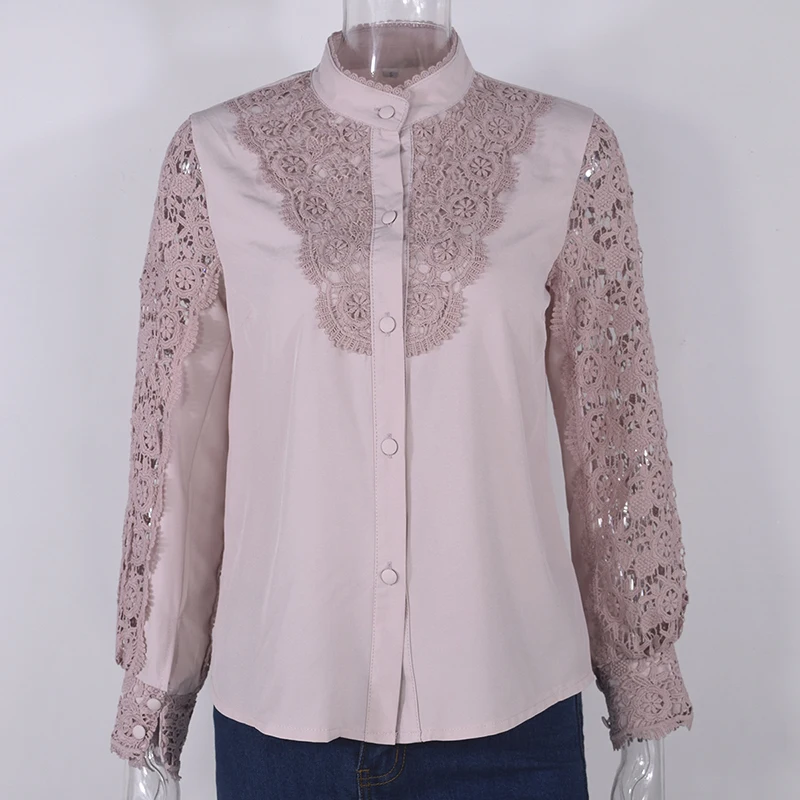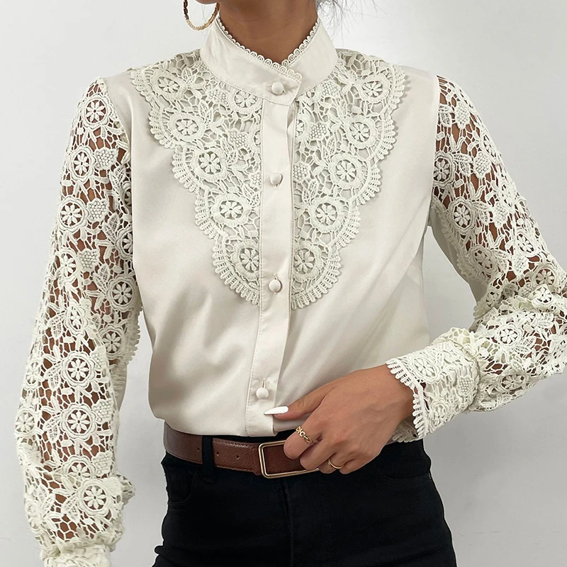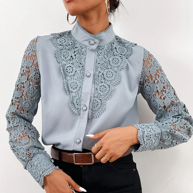 Женская рубашка с воротником-стойкой, повседневная однотонная офисная блузка, весна Кружевная блуза с вышивкой, 2021
