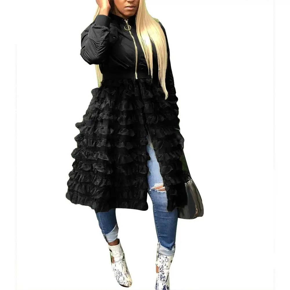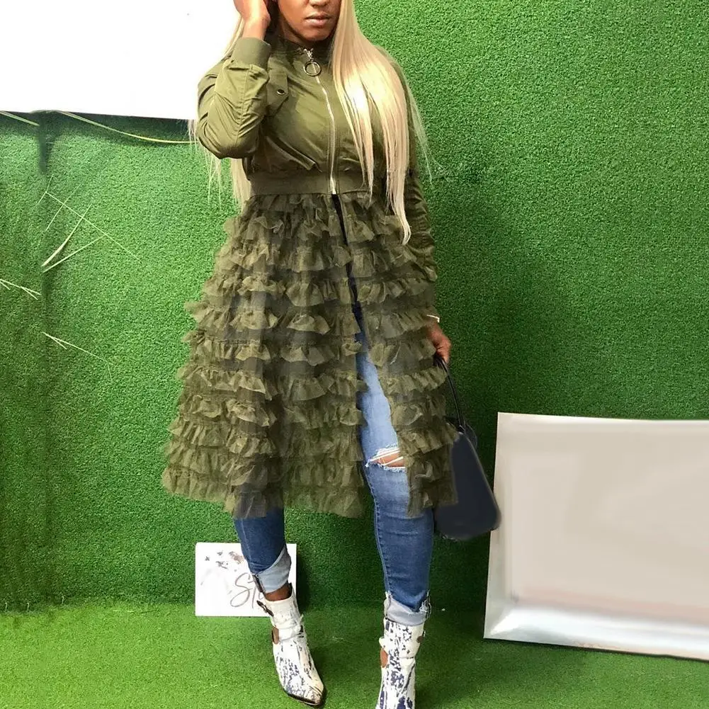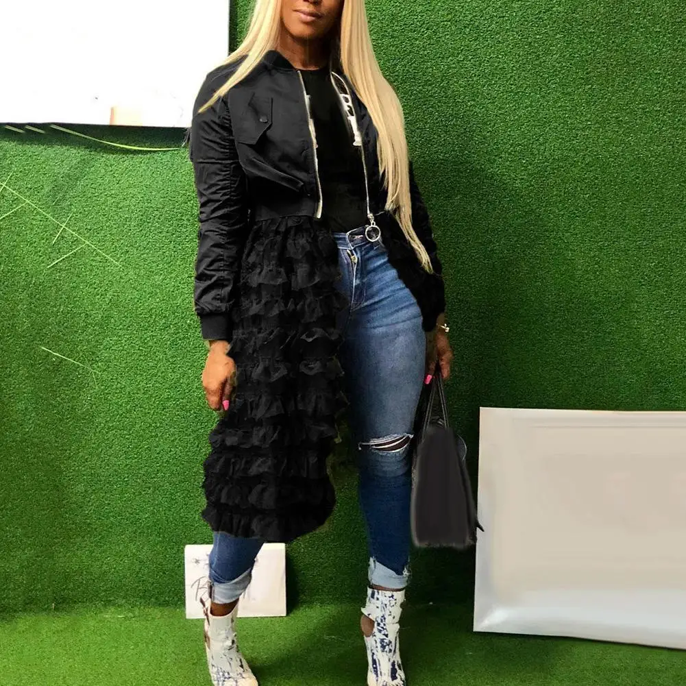 80% Лидер продаж!; Сезон осень; Модная женская куртка на молнии с длинными рукавами и кружевом; Сетчатая юбка миди платье пальто