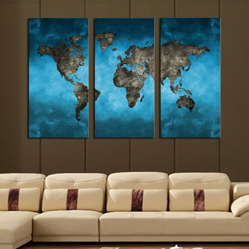Синяя абстрактная карта мира, набор из 3 предметов, Картина на холсте, Современное украшение для дома, гостиной, спальни, настенное украшение, картина