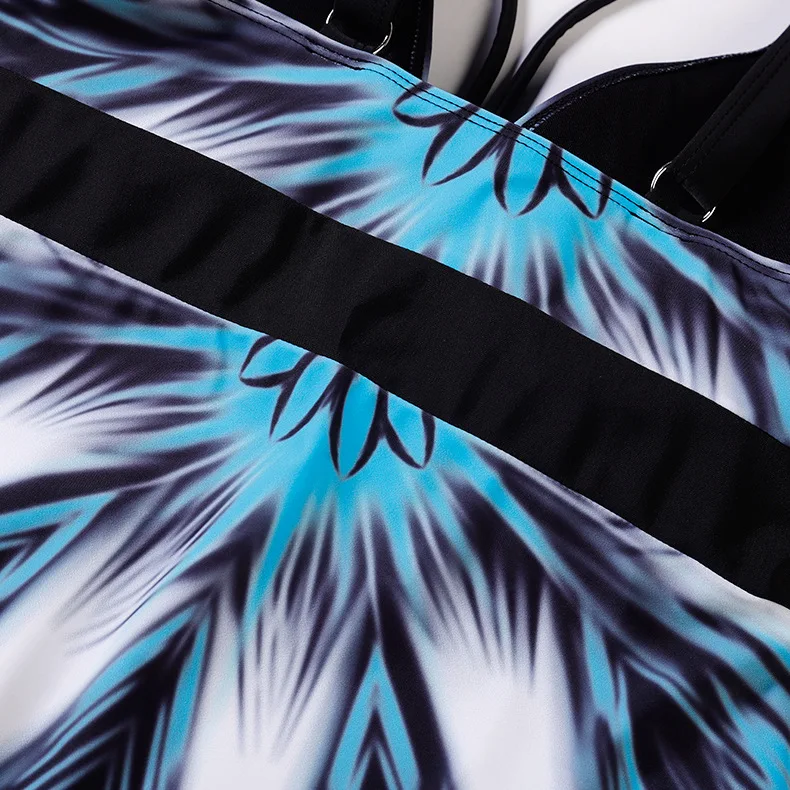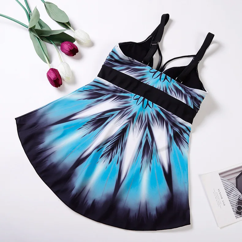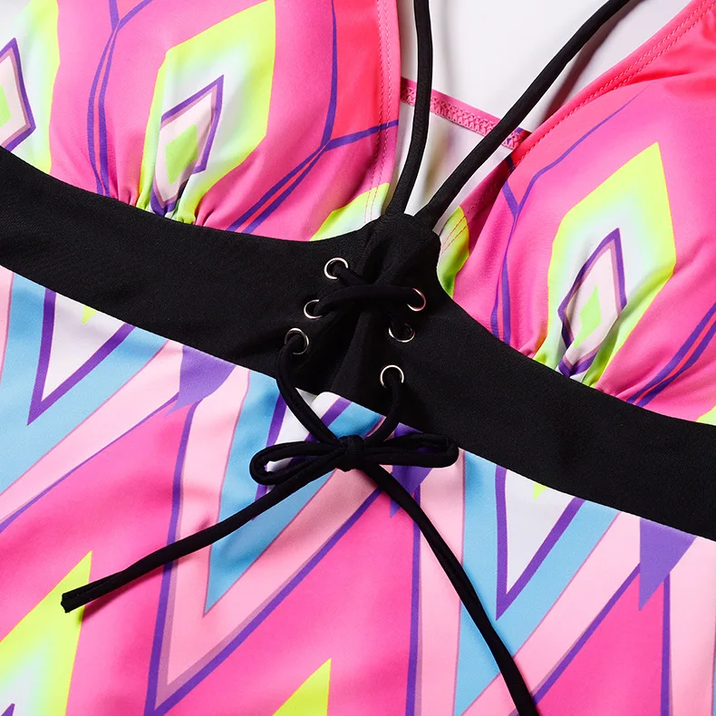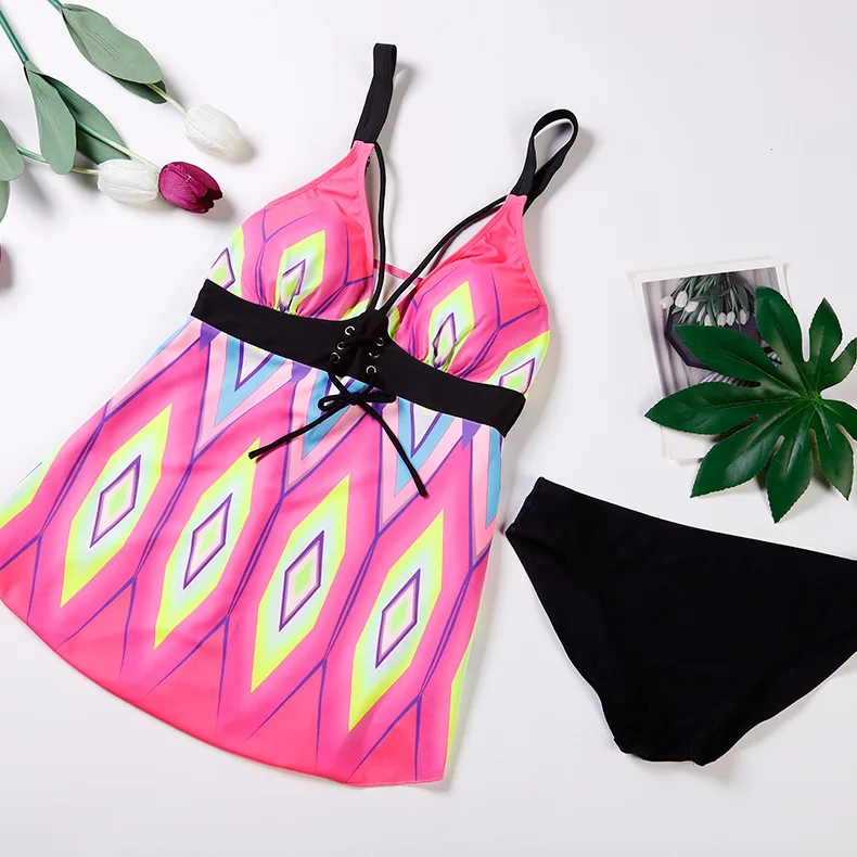 Винтажный танкини размера плюс, комплекты для плавания, женский купальник с принтом на животике, женский купальник из двух частей, на шнуровке, бандаж, пляжная одежда, купальный костюм