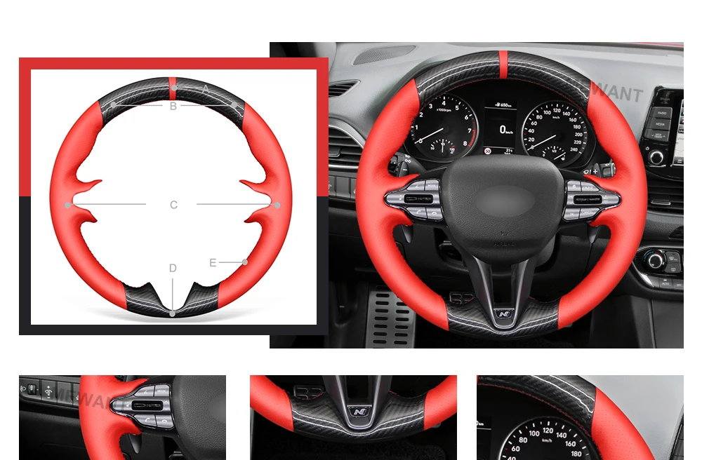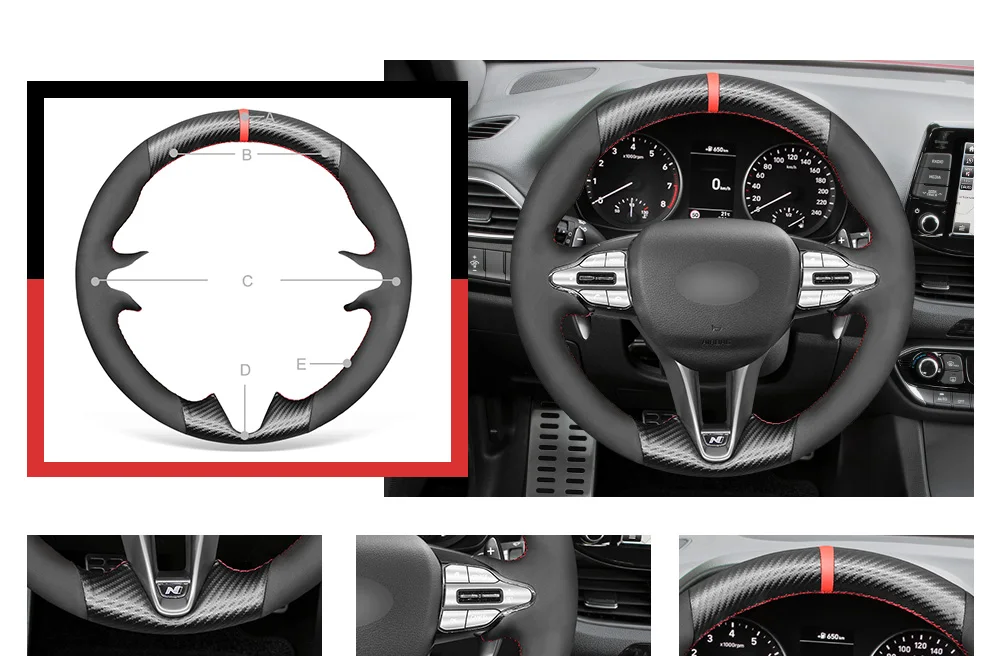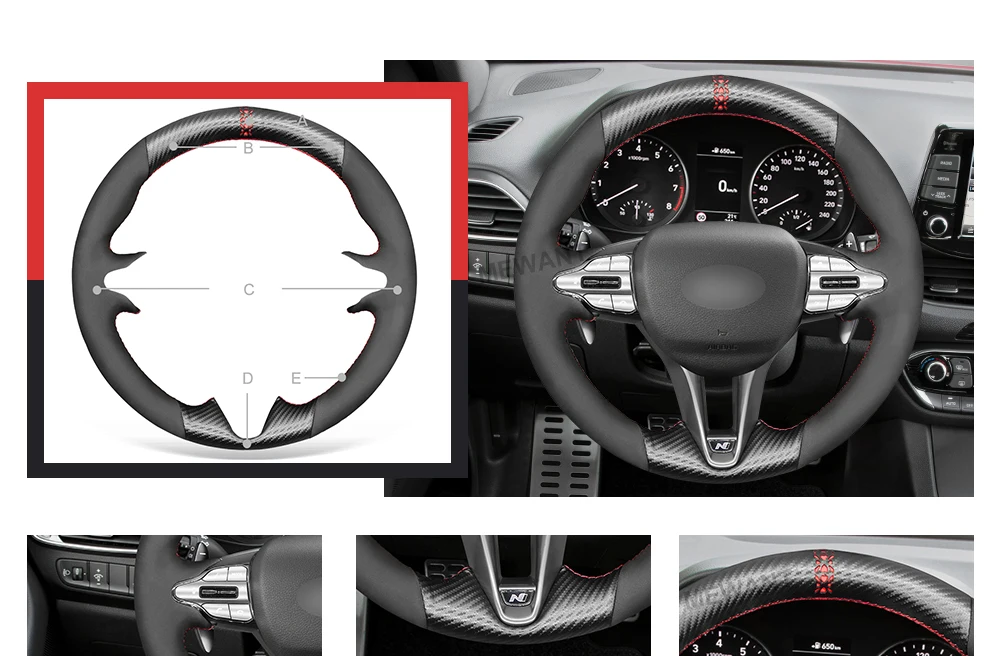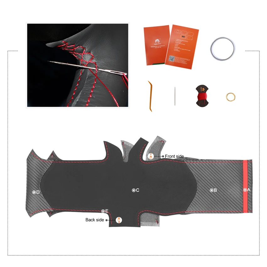 A: красные полые украшенияB + D: черный матовый PU углеродное волокноC: Черная синтетическая замшаE: Красная Нить
