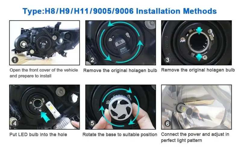 1. Ярче, чем галогенные/ксеноновые лампы, более мощные, чем галогенные.2. Полностью алюминиевый корпус и быстрое охлаждение, обеспечивая безопасный температурный диапазон и длительный срок службы до 30000 часов3. Водонепроницаемость: IP68, может использоваться в любых условиях воды4. Быстрый запуск: быстрое включение/выключение времени отклика5. Простая установка: все в одной модели, такие же, как оригинальная автомобильная лампа, подключи и работай