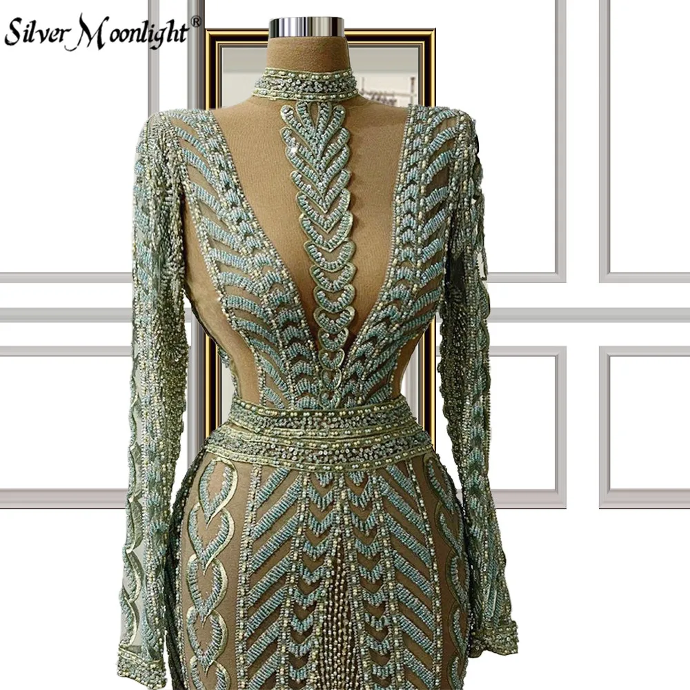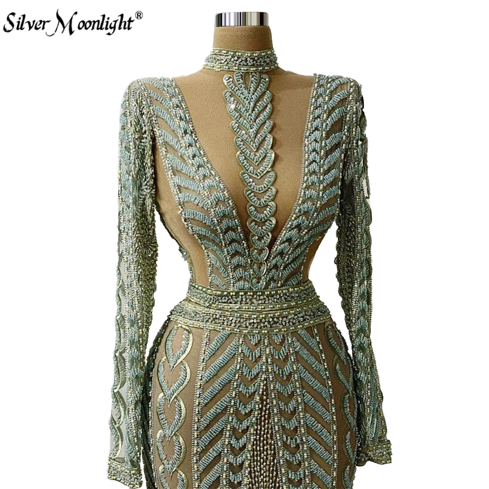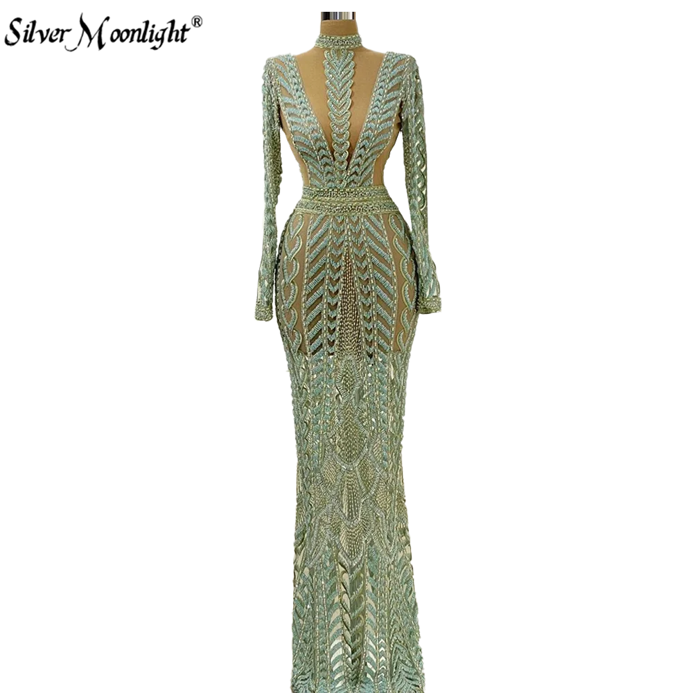 Кружевное вечернее платье-Русалка с высоким воротом, с иллюзией, длинными рукавами и бисером, зеленое вечернее платье для вечерние Ринок, 2021