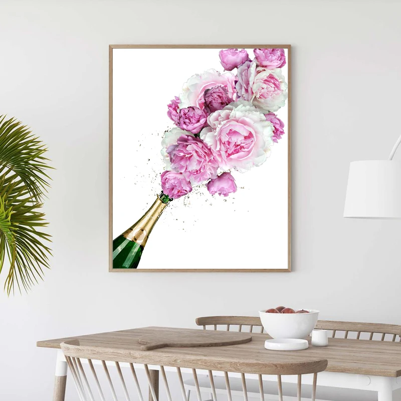 Бутылка шампанского, акварельная картина, Настенный декор для кухни, бара, модный розовый, шампанское, спиртовой постер, холст, печать, Настенная картина