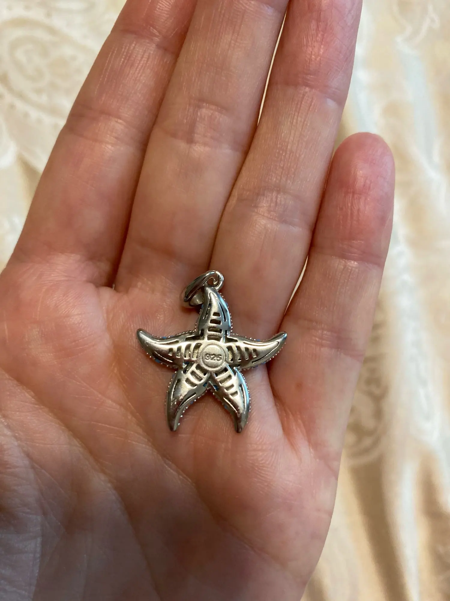 Хорошо получил с благодарностью. Я увидел 2 Пятна без голубых кристаллов. Однако из-за небольшого размера кулона он практически не заметен.