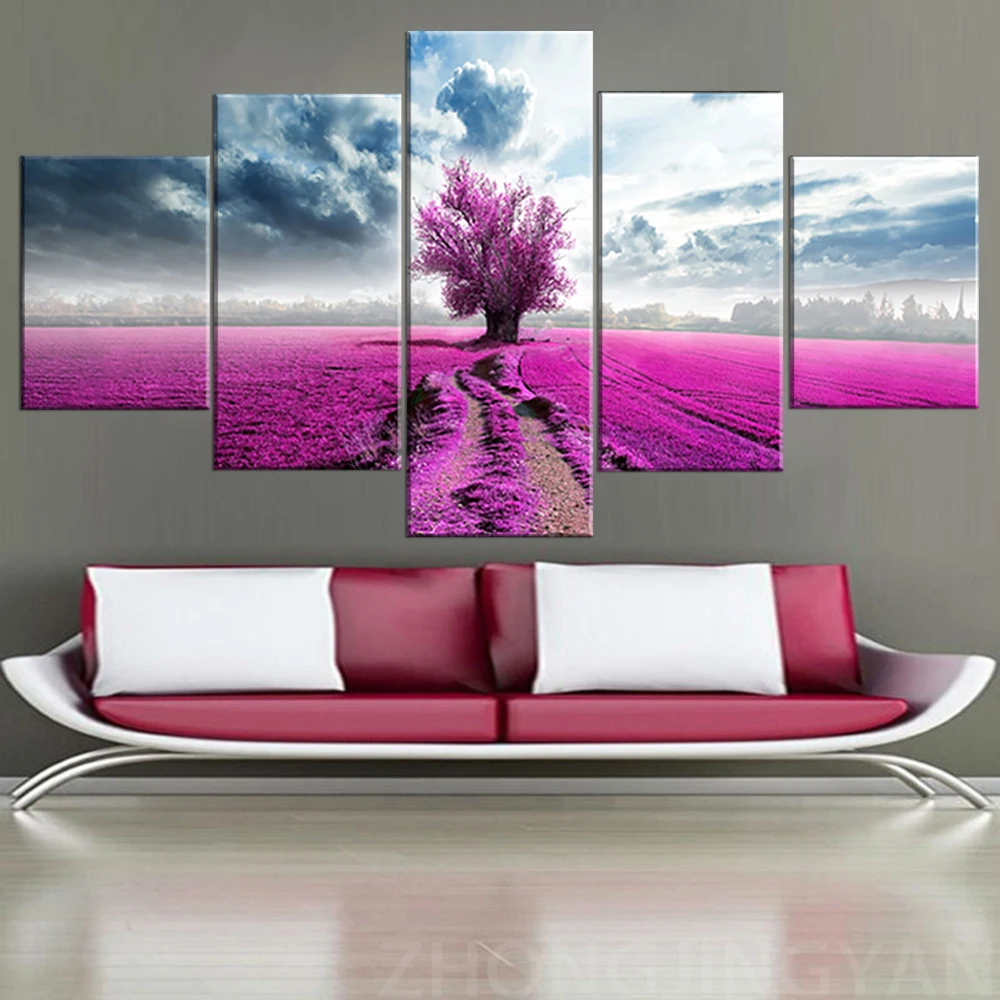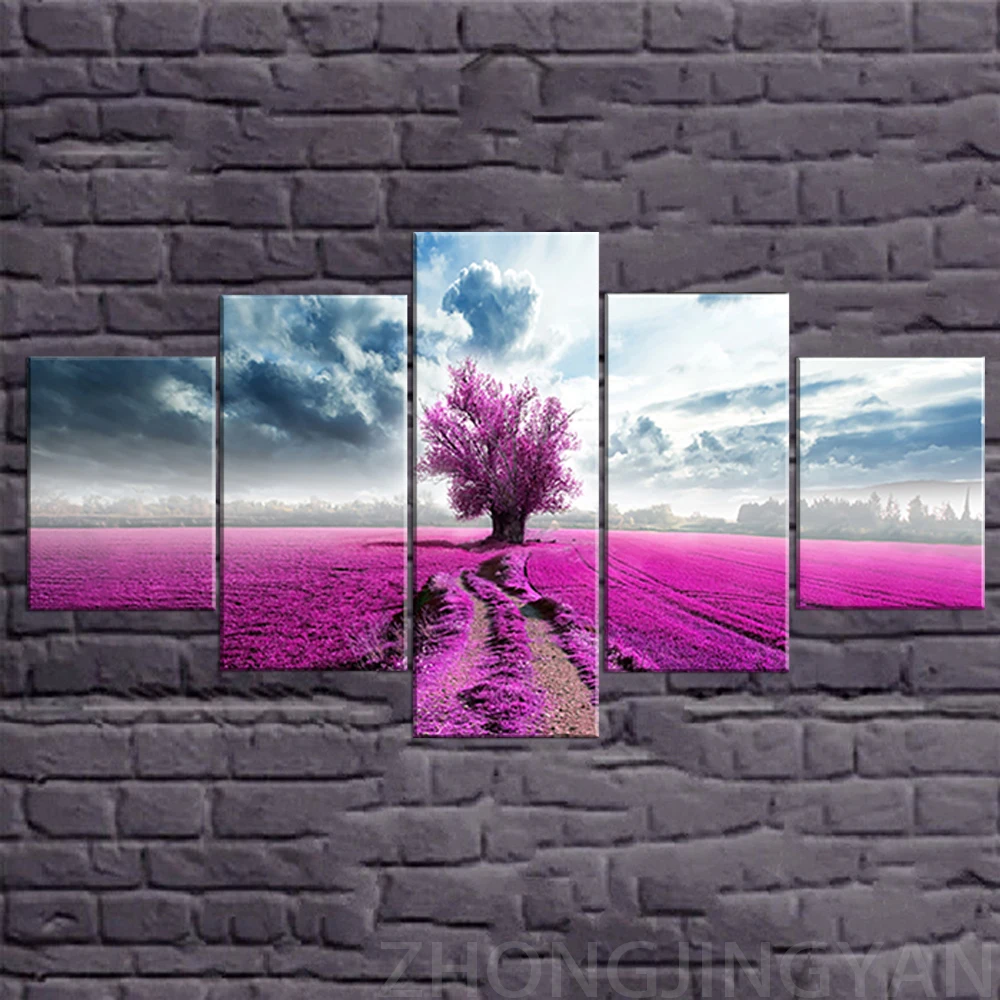 Современные настенные картины с рамкой для гостиной, 5 панелей, розовые, лавандовые цветы, ландшафт, украшения для дома, постеры с HD печатью, живопись