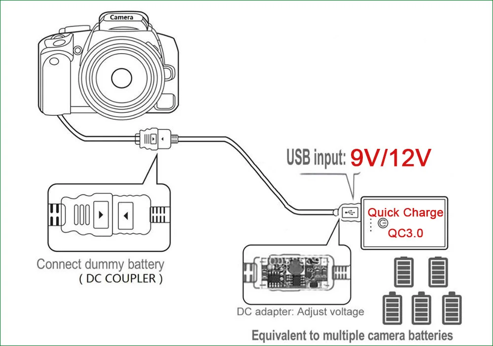 «AC-CU905 usb-кабель» интеллектуальное питание, камера обеспечивает достаточную мгновенную мощность.Аббревиатура Qualcomm Quick Charge 3,0 QC3.0Usb-вход: интеллектуальная зарядка QC3.0 / QC4.0 (9V 2A-3A, 12V 1.5A).Выход постоянного тока: 7,4 V.Длина usb-кабеля: 150 см