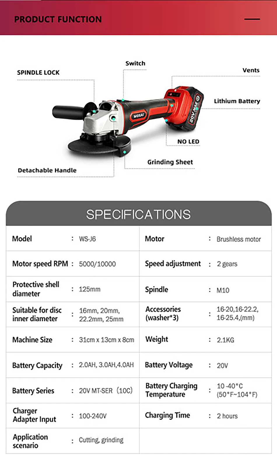 VVOSAI M14 Беспроводная угловая шлифовальная машина 20 в литий-ионн...