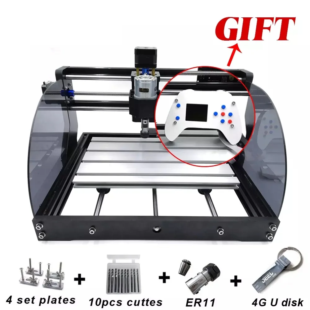 Размер оправы: 400*330*240 ммРабочая зона: 300*180*40 ммШпинделя: 775 мотор шпинделя 24V:10000r/мин, поддержка PWM 0-100% регулируемаяSoftwear: GRBL системы управления, GRBL контроллер, LiteFire.Система поддержки: Windows XP / Win 7 / Win 8 / Win10 HomeШагового двигателя: Fuselage длина 34 мм, ток, 1.33A, 12v. Крутящий момент 0.25N/мТип питания: мощность переменного токаМатериал: алюминий + бакелитМощность: 24 В 5АВыходное напряжение: 110-240 ВХарактеристики патрона: ER11 3,175 мм (может соответствовать 0-7 мм)Лазер: 500 мВт, 2500 мвт, 3500 МВт, 5550 МВт, 15000 МВт. (15000 мВт может гравировать на нержавеющей стали и около 3 мм деревянных материалов)