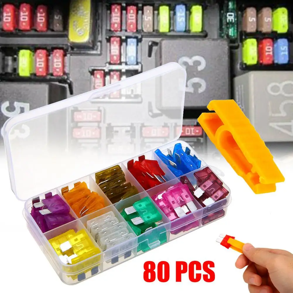 Автомобильные предохранители со стандартным лезвием 12 В, 80 шт., набор автоматических предохранителей со средним лезвием, 3 а 40 А, набор в ассортименте + 1 шт. Набор съемников