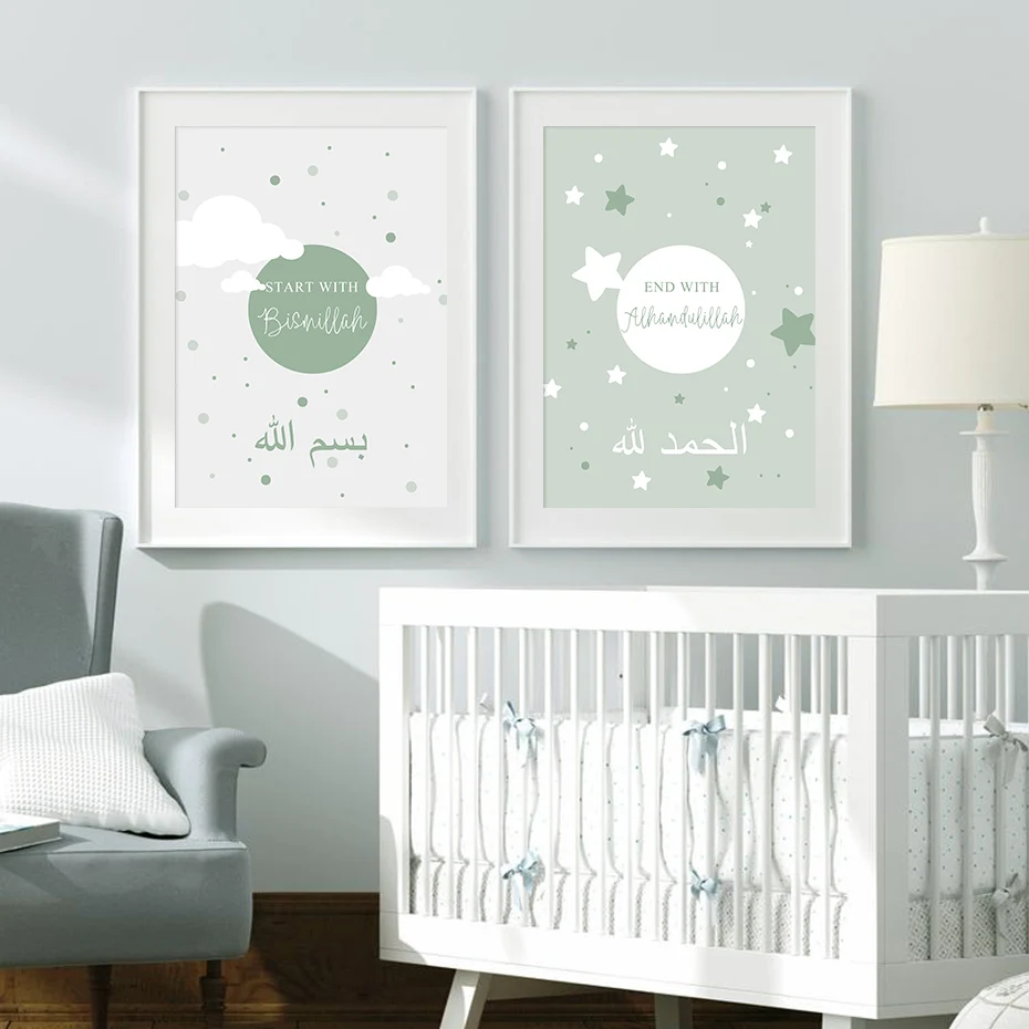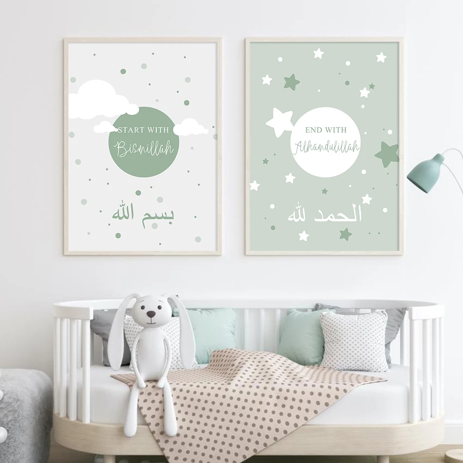 Исламский мультфильм серые облака Звезды Луна плакат для детской хо...