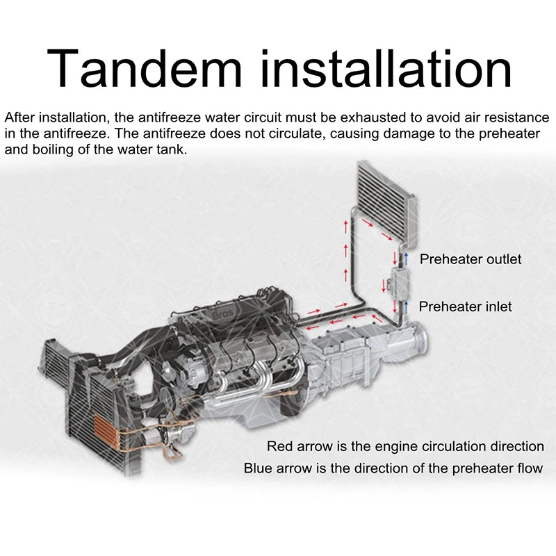 Принцип работы: Предварительный нагреватель использует источник питания 220 В для циркуляции и нагрева антифриза через встроенный насос и электрические нагревательные элементы для улучшения температуры двигателя.
