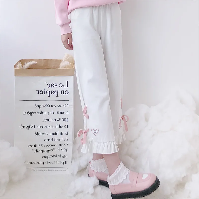 Брюки женские с вышивкой в виде сердца, повседневные милые штаны с оборками, с широкими штанинами, в японском стиле, для девушек, на весну