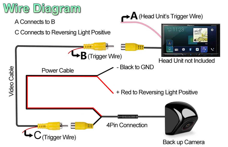 Совет: если ваш монитор-стерео радио android, вам нужно подключить красный триггерный провод кабеля 6 м "A" и "B":"А" Подключите фонари заднего хода Питание DC 12V +."B" подключить к радиотриггерному проводу.