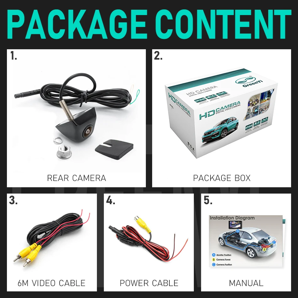 1. Камера заднего вида (вертикальная установка)2 посылка вочная коробка3. Видеокабель 6 м4. Кабель питания5. Руководство пользователя