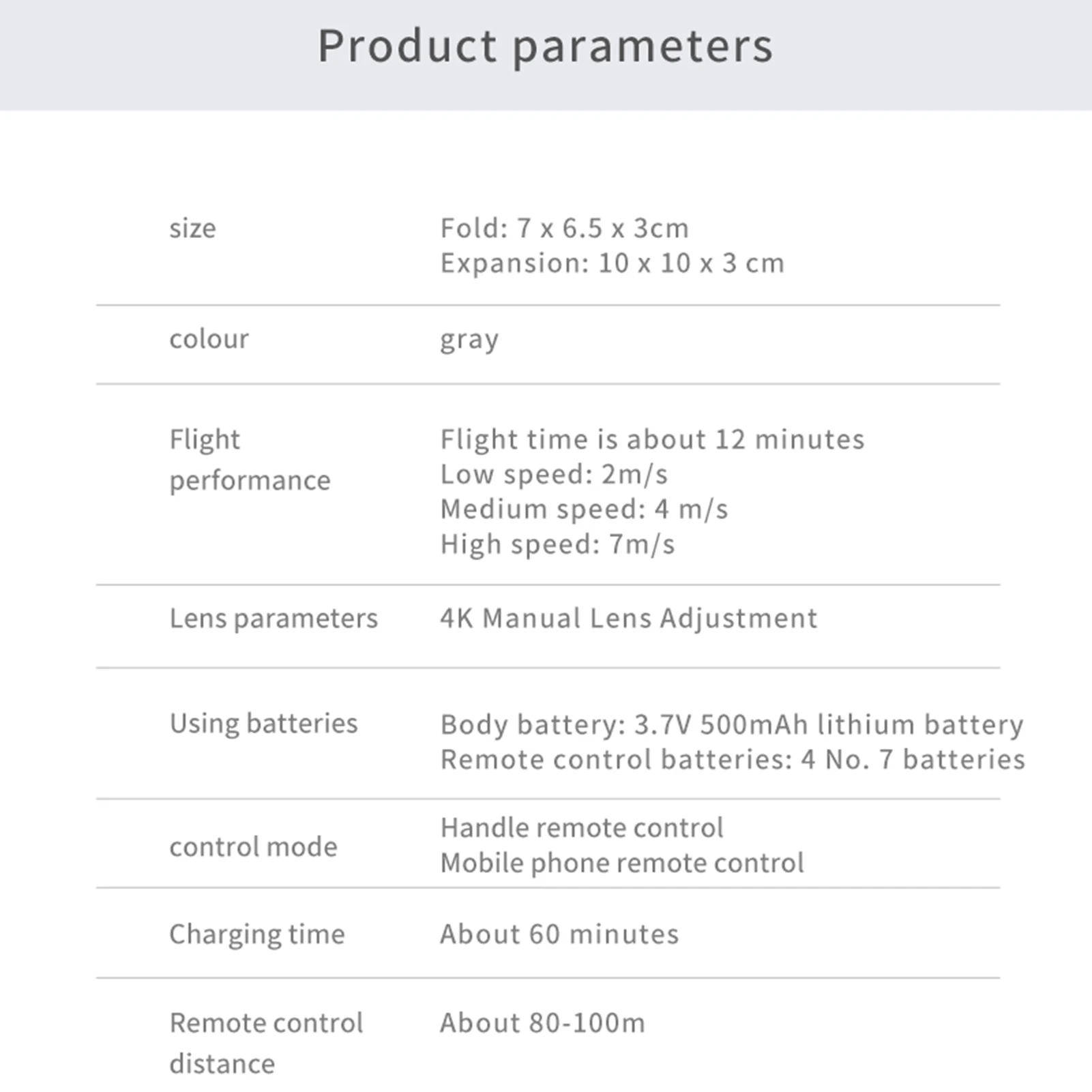 Спецификация:Номер: мини-Дрон KY905Название: мини-КвадрокоптерМатериал: АБСРазмер сумки для хранения: около 22*17*6,5 см/8,66*6,69 * дюймаЦвет: серый металликСпособ упаковки: сумка для храненияБатарея пульта дистанционного управления (входит в комплект): встроенная литиевая батареяПараметры аккумулятора: 500 мАчВремя полета: около 10 минутВремя зарядки: около 60-70 минутРасстояние дистанционного управления: около 150 метров/492,13 футовРасстояние передачи изображения Wi-Fi: около 100 метров/328,08 футовУпаковочный лист:Мини-Квадрокоптер * 1Пульт дистанционного управления * 1Руководство * 1USB-кабель * 1Защитный круг * 4Главный вентилятор в режиме ожидания * 4Защитный круг * 4Отвертка * 1