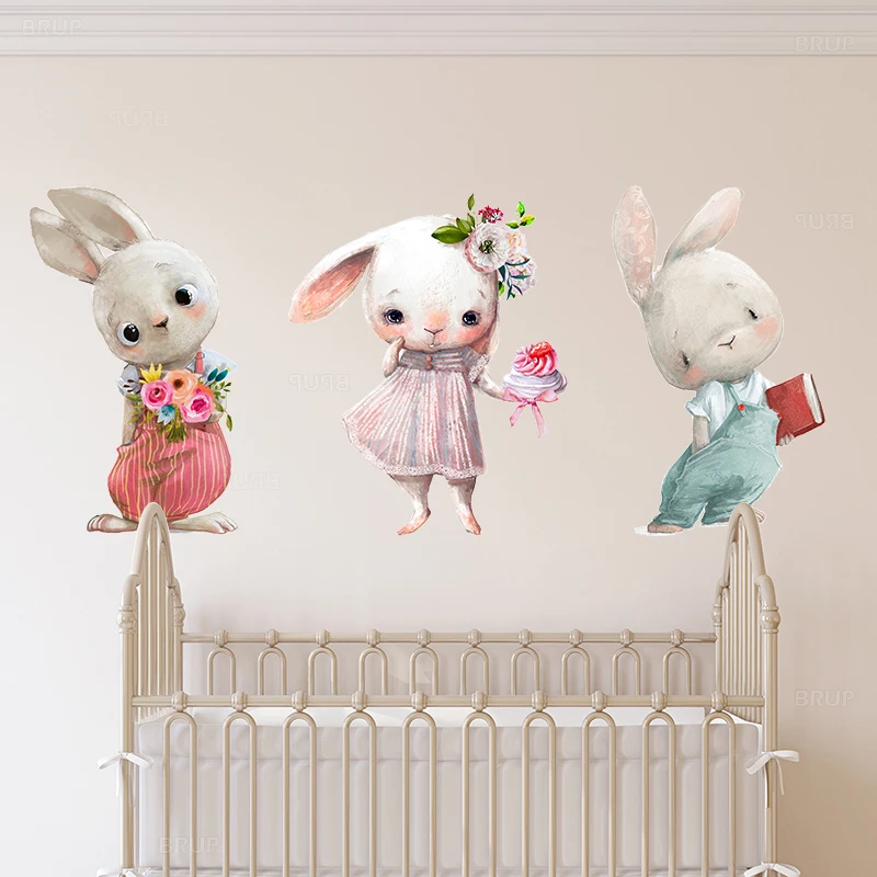 Акварельные Мультяшные настенные стикеры в виде кролика, Детские фо...