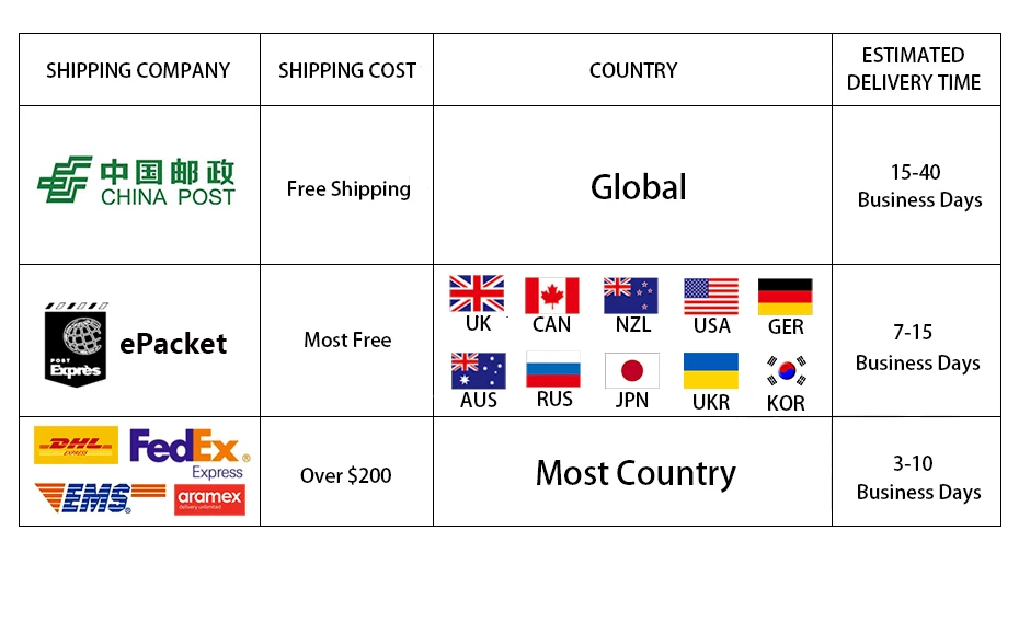Отгрузка1. Время обработки:Есть много заказов, которые нужно отправить каждый день, обычно мы организуем доставку в течение 1-5 дней, пожалуйста, терпеливо подождите. И извините за неудобства.Примечание:1. Если вы выбираете Экспресс-доставку, пожалуйста, предложите нам свой правильный контактный номер телефона, чтобы избежать контакта местного почтового отделения с вами, чтобы забрать посылку, когда она прибудет.2. Мы не поддерживаем адрес P.O.Boxes, пожалуйста, оставьте нам сообщение для вашего правильного адреса при размещении заказа.3. Если вам нужно изменить адрес доставки. Оставьте сообщение сразу после размещения заказа.