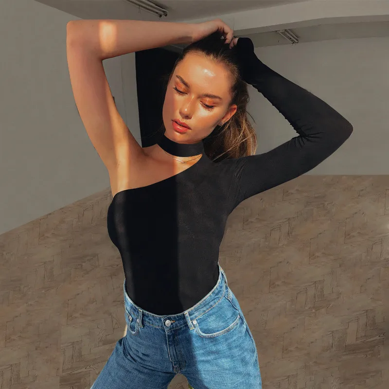 Женское хлопковое боди с лямкой на одно плечо, новое модное однотонное облегающее боди с длинным рукавом на зиму и весну 2021