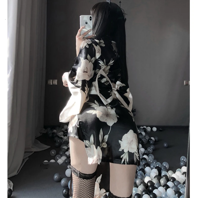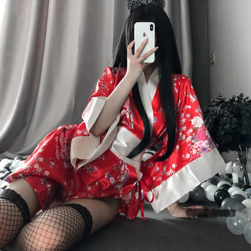 Кимоно женское пикантное в традиционном японском стиле, одежда для косплея, юката, пижамные костюмы, мягкий шелковый пояс, комплект из 3 предметов, черный красный