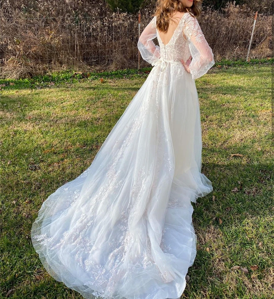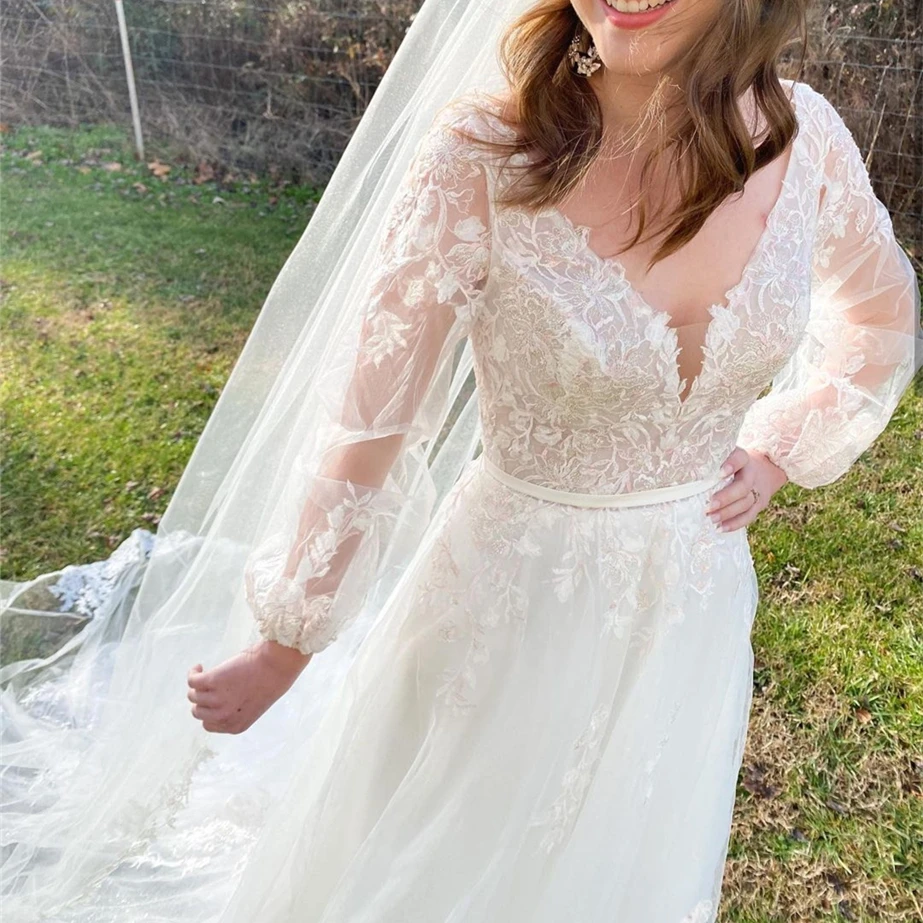 Свадебное платье-трапеция с V-образным вырезом и рукавами-фонариками, кружевное платье с аппликацией, блестками и открытой спиной, Тюлевое платье до пола со шлейфом для невесты, Новинка
