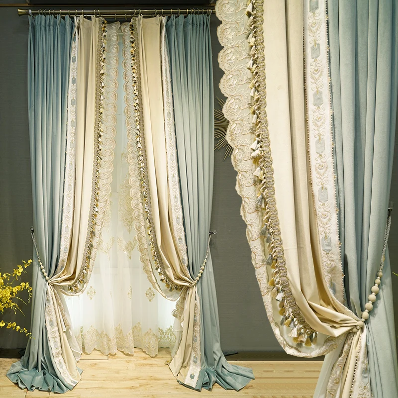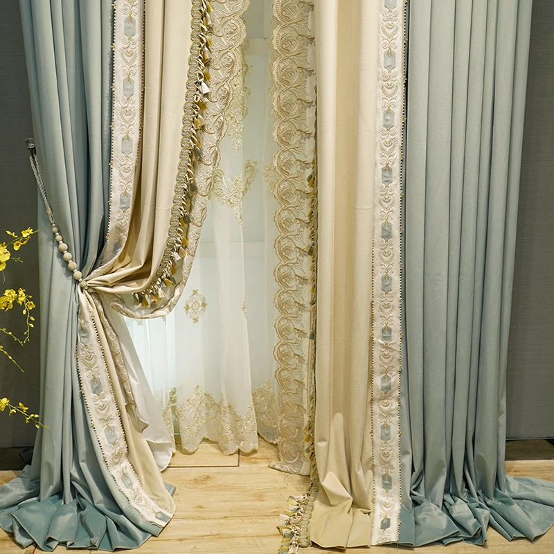 Роскошные французские новые дымчатые синие бархатные занавески для гостиной с вышивкой бежевые простые затемняющие шторы для спальни