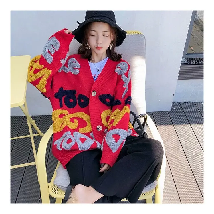 Женский однобортный Кардиган с длинным рукавом, вязаный свитер свободного покроя с буквенным принтом в Корейском стиле, весна-осень 2021