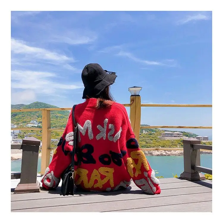 Кардиган женский вязаный, красный, свободный, с вышитыми буквами, О...