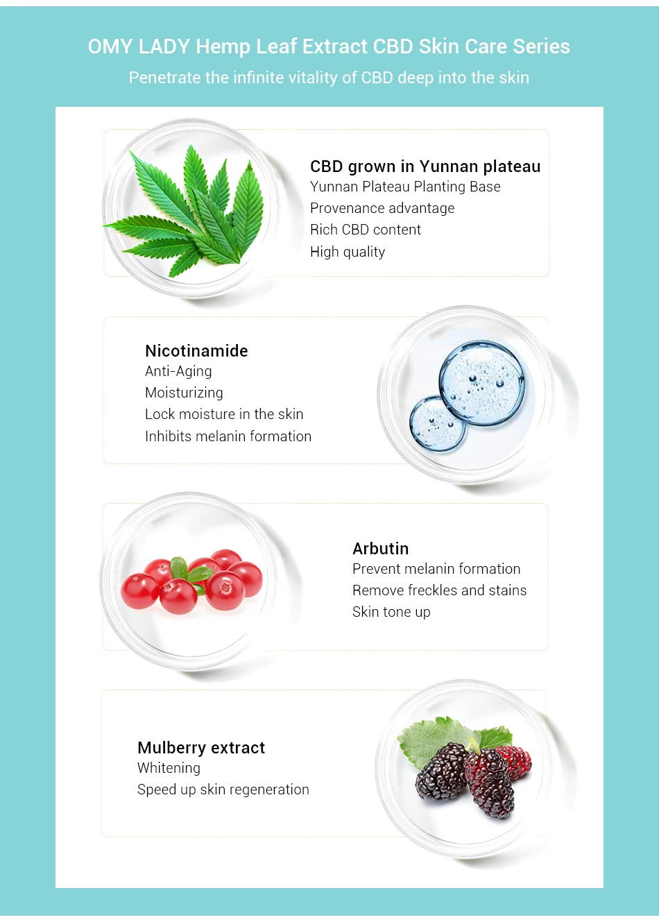 Никотинамид, арбутин, экстракт тутового дерева 1. Каннабидиол, Выращенный на плато Юньнань Юньнань плато посадки базы Преимущество Прованса Богатый каннабидиол Высокое качество 2.Nicotinamide Защита от старения Увлажняющий Блокировка влаги в коже Ингибирует образование меланина 3. Арбутин Предотвращает образование меланина Удаление веснушек и пятен 4. Экстракт тутового дерева Отбеливание Ускоряет регенерацию кожи
